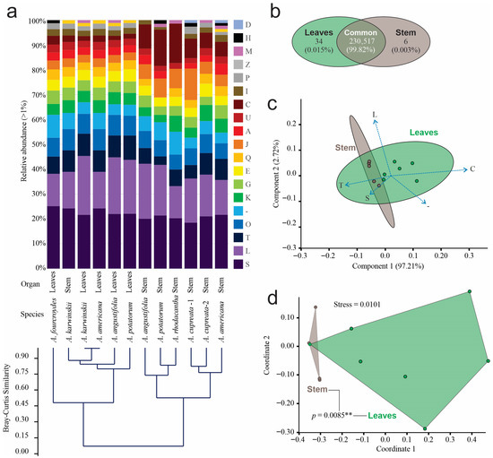 The first two components of the ordination analysis by PCA explained 100% of the data diversity as being signal transduction (T), as well as energy production and conversion (C), representing the functional orthologous category with higher contribution in the first component, and replication and repair (L), constituting the orthologous category with higher contribution in the second component (Figure 3c). SIMPER based on Bray–Curtis distances identified four COGs responsible for 54.4% of the differences between organs, where energy production and conversion (C) accounted for 21.27%; replication and repair (L) for 15.55%; translation (J) for 11.06%, and signal transduction (T) for 6.51%. The number of COGs in the leaf samples was higher than that of the stem samples in all cases, except in A. karwinskii, where the number of orthologous genes was slightly higher than that of the stem of the same species. The first two dimensions of the NMDS analysis also grouped functional orthologous genes by organ, with a stress level of 0.0101. The statistical analysis of orthologous genes revealed a significant difference (PERMANOVA, p = 0.0085 **) by organ (Figure 3d).