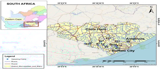 Map of the Eastern Cape Province (ECP) including sampling points around the Amathole District Municipality (ADM). The map was constructed using ArcGIS 10.6.1. Abbreviation: S, Study sites.