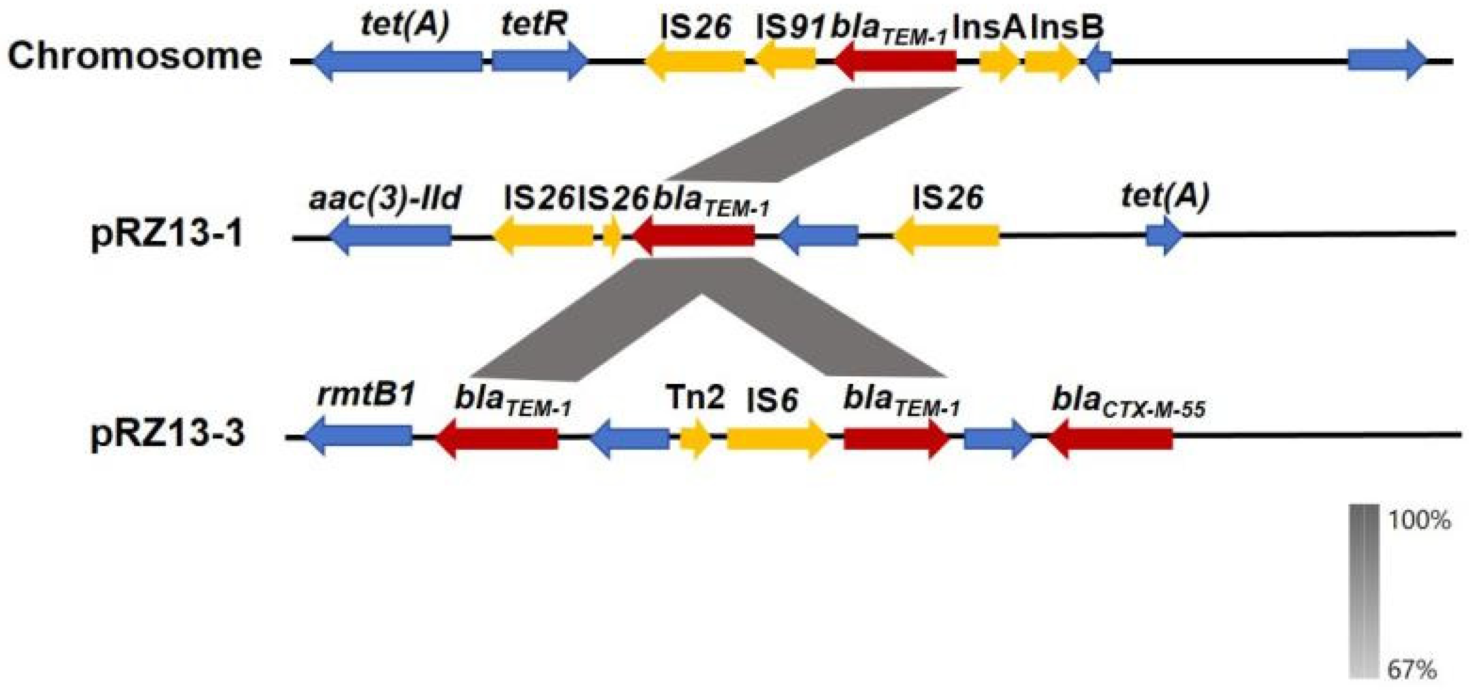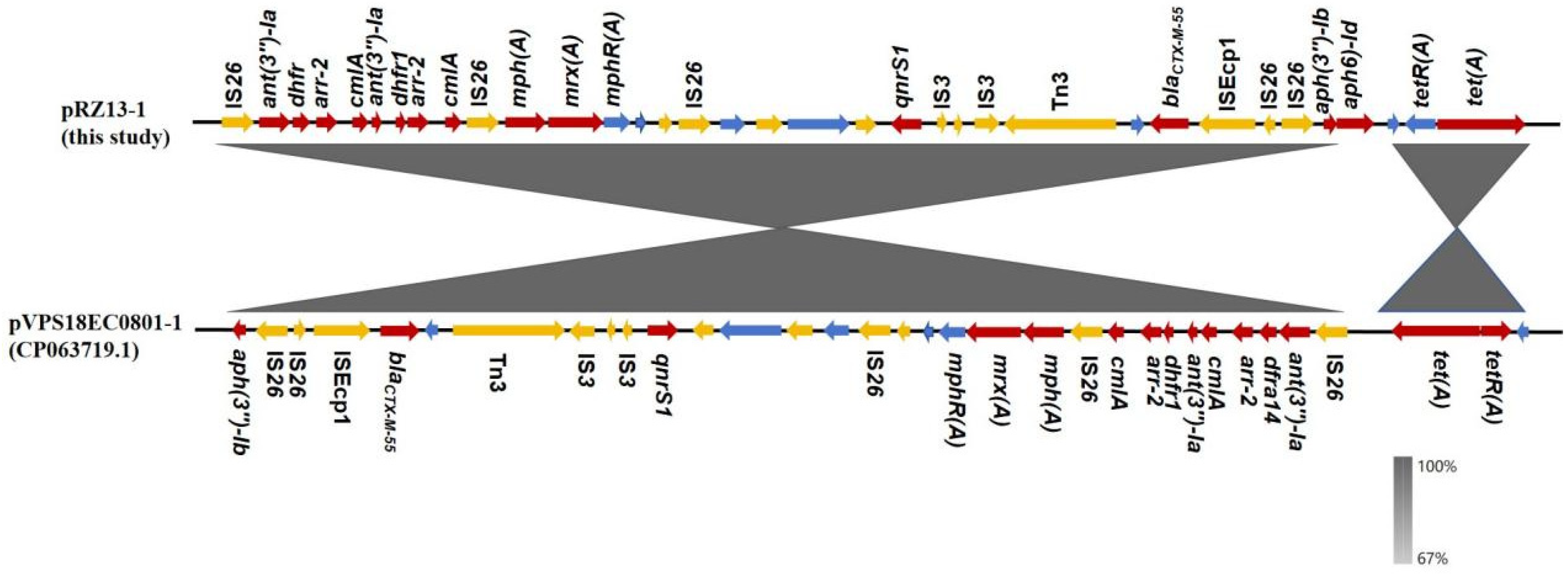 3.2. Characteristics and Transferability of the Multidrug-Resistance Plasmid pRZ13-1