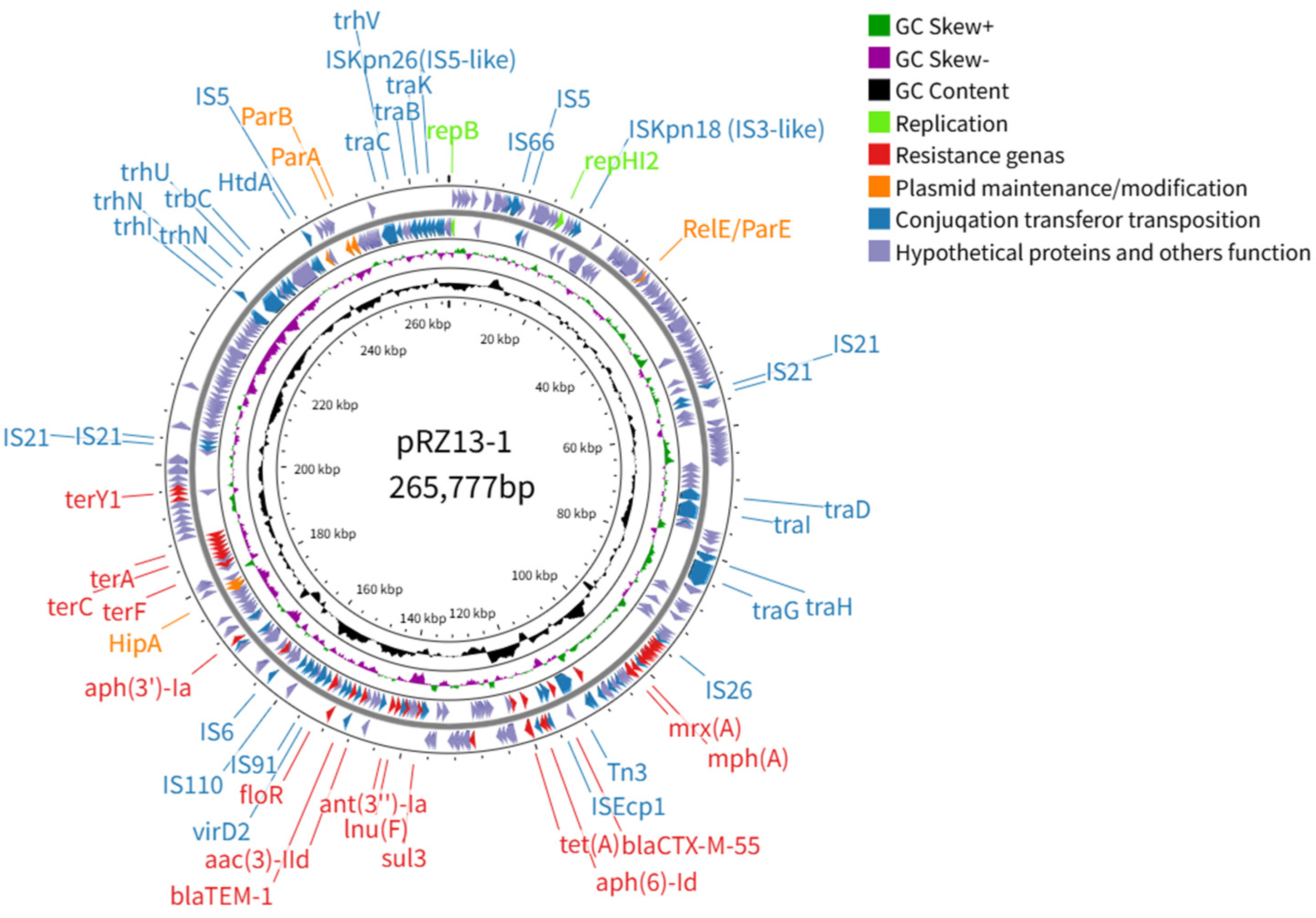 | pRZ13-1 | 265,777 | 46.80% | 356 | lncHI2-lncHI2A | repB, repHI2 | terC | aac(3)-IId, aph(6)-Id, aph(3″)-Ia, aph(3″)-Ib, blaCTX-M-55, blaTEM-1, ant(3″)-Ia, mph(A), mef(B), mphR, lnu(F), floR, qnrS1, sul3, dfrA14, cmlA, arr-2, mrx(A), tet(A), terABCDEFZY1 |