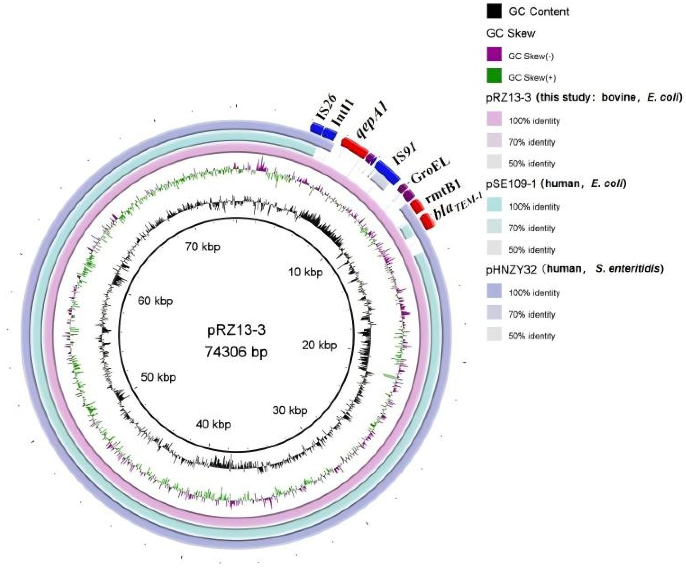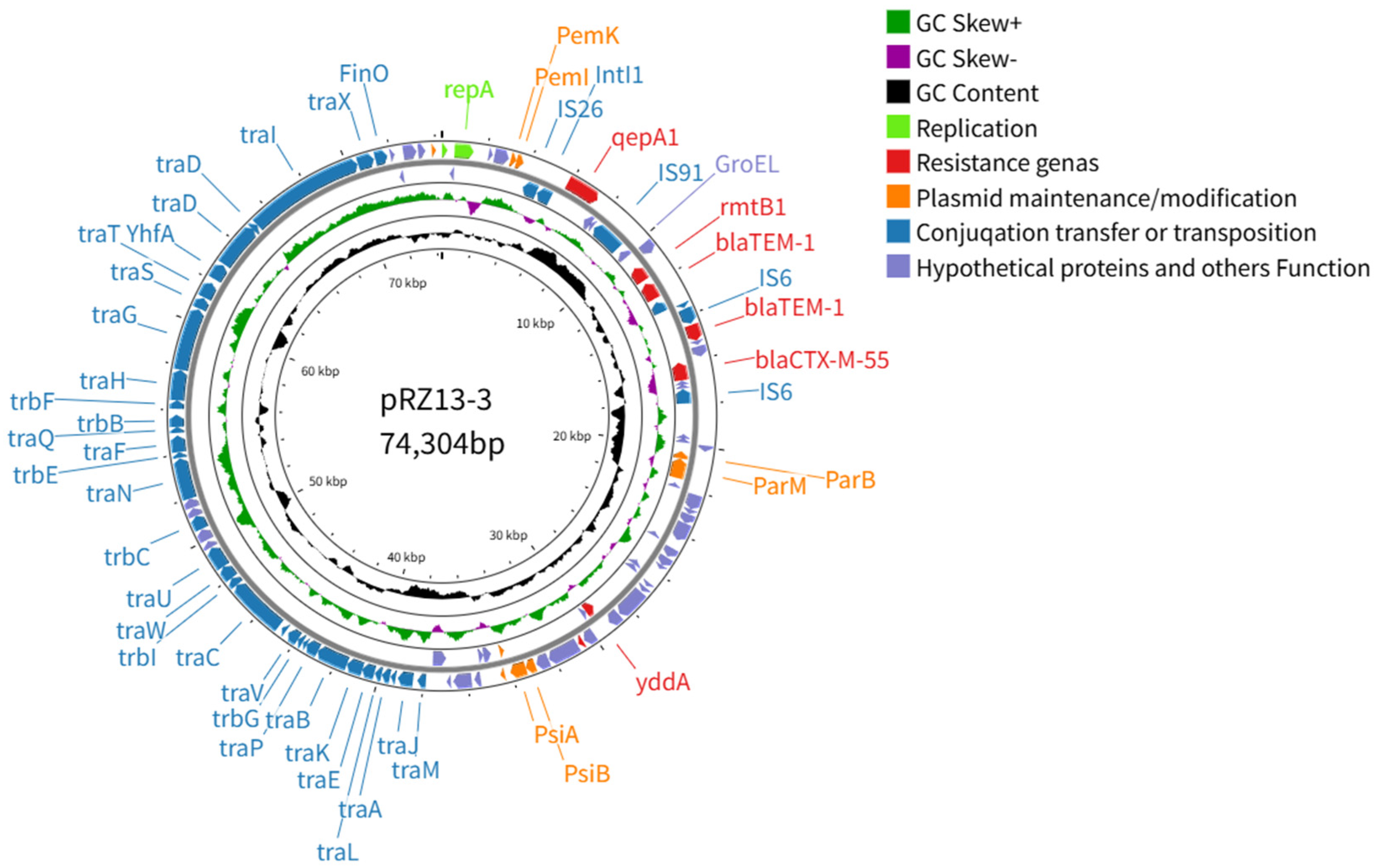 | pRZ13-3 | 74,304 | 53.00% | 110 | IncFII | repA | traJ, traT | qepA1, rmtB, blaTEM-1, blaCTX-M-55 |