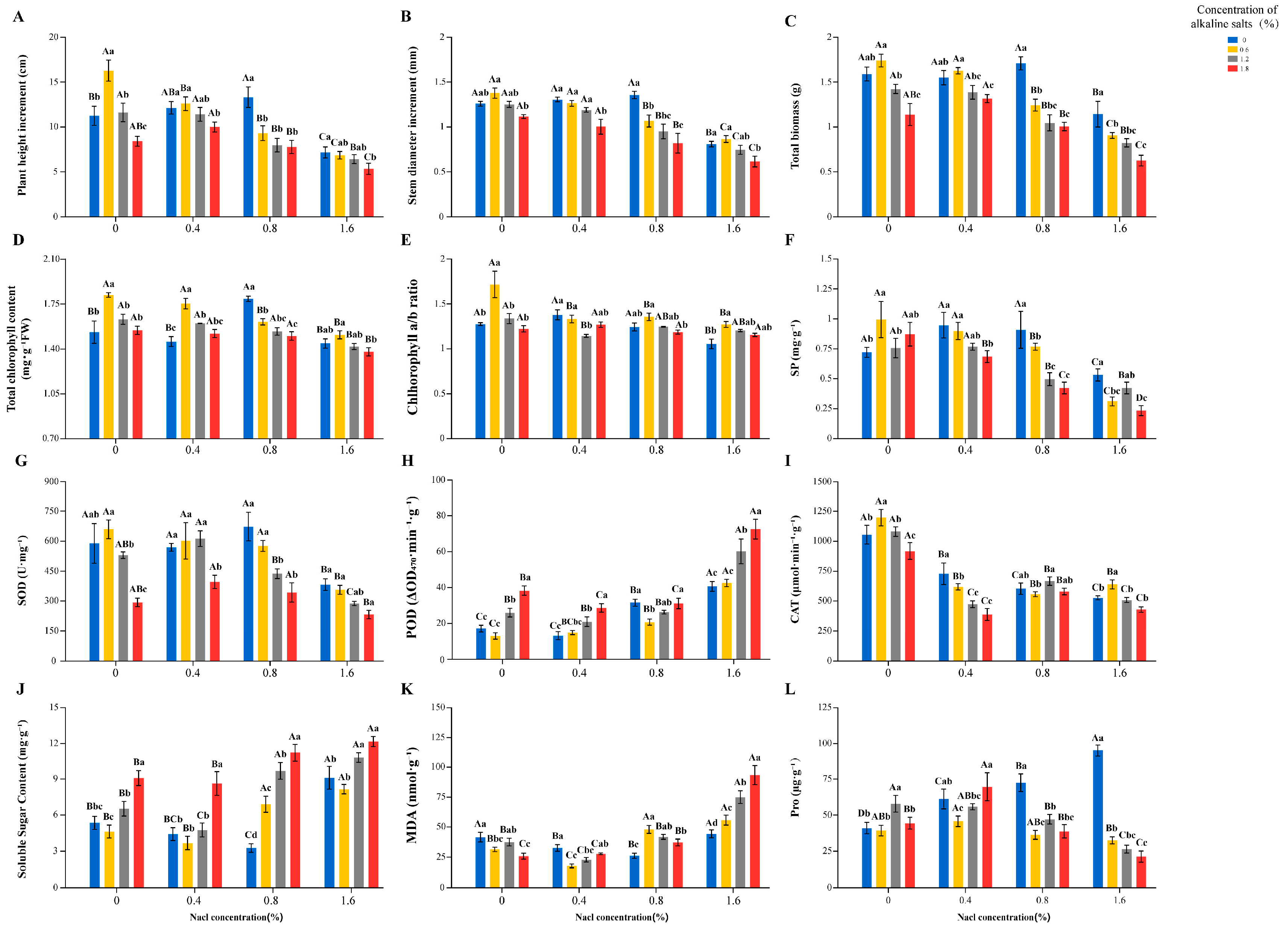 3.1.1. Effects of Salt-Alkali Stress on Growth Characteristics of Quercus mongolica Seedlings