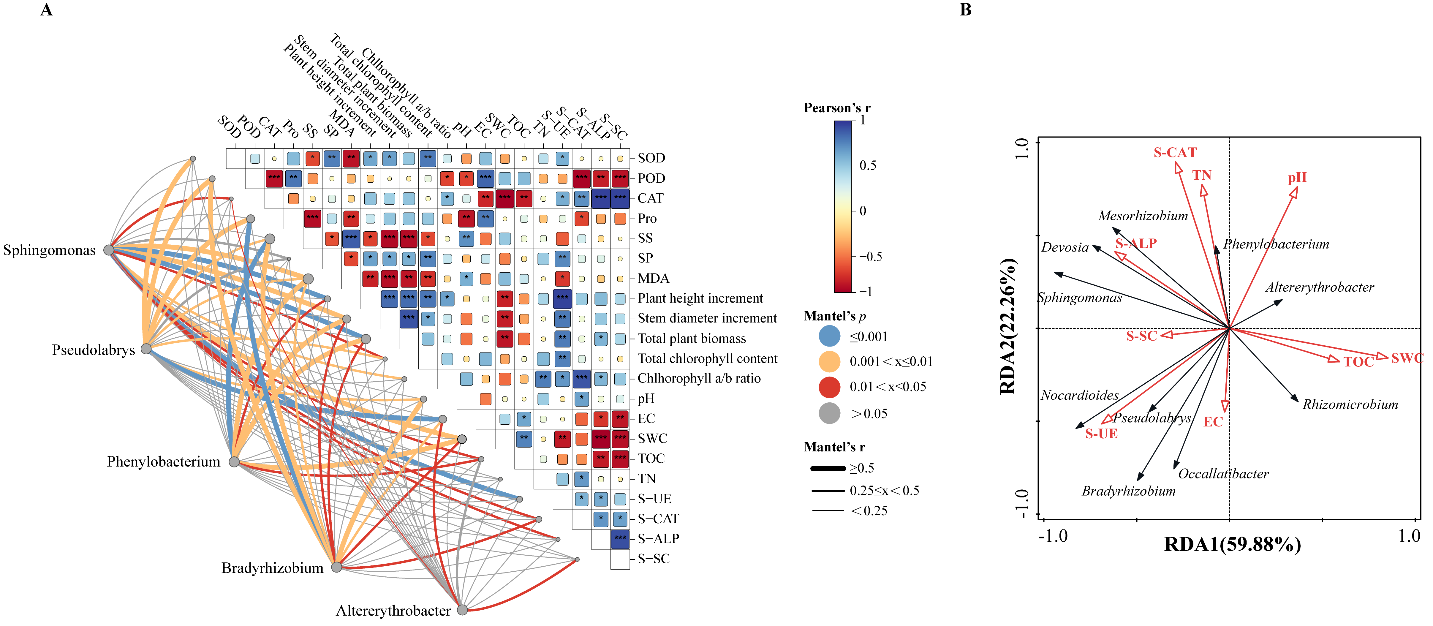 3.3. Association Analysis of Plant Physiology, Rhizosphere Soil Properties, and Microbial Community