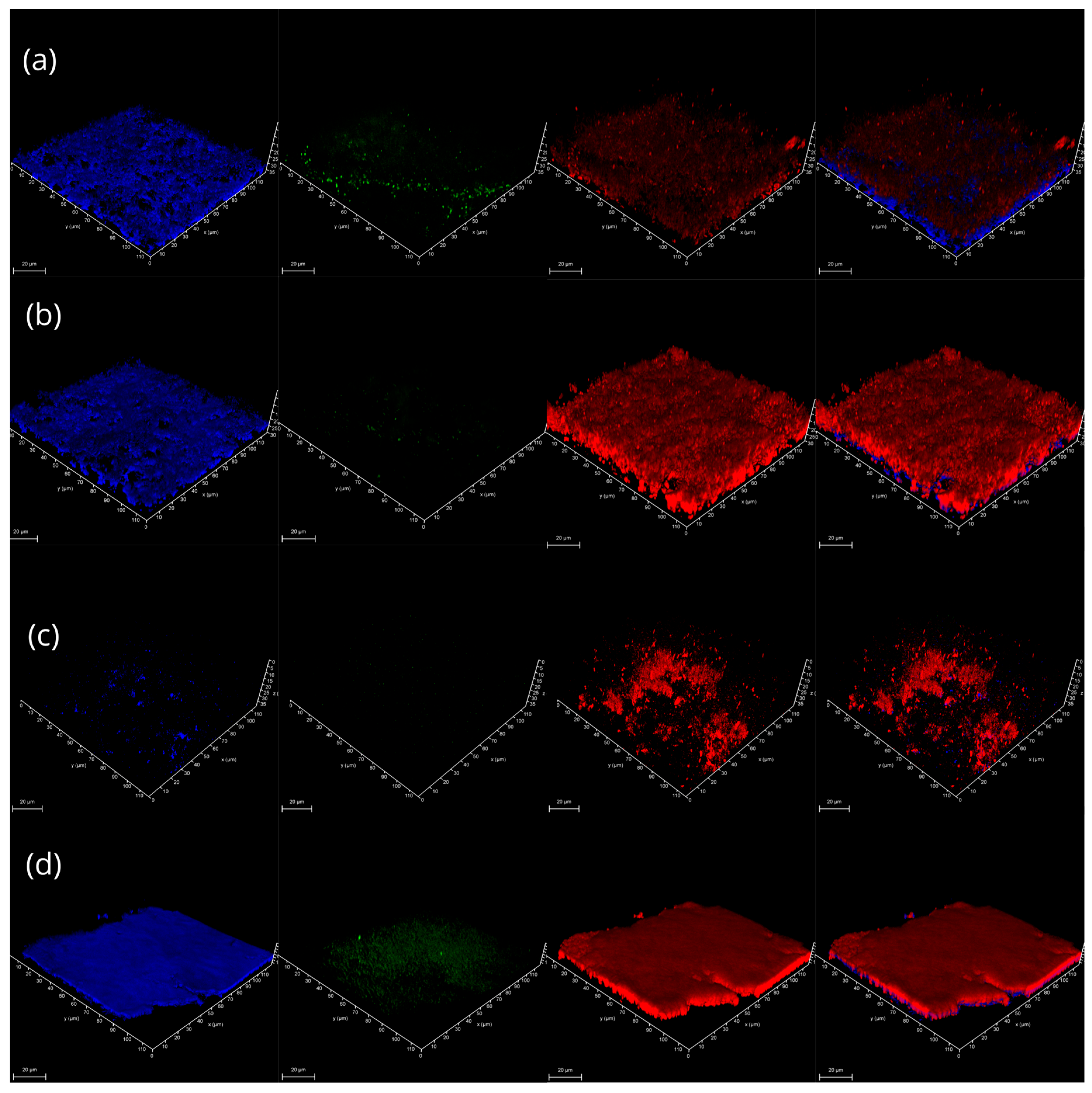 - Gnilitskyi, I.; Rymar, S.; Iungin, O.; Vyshnevskyy, O.; Parisse, P.; Potters, G.; Zayats, A.V.; Moshynets, O. Femtosecond laser modified metal surfaces alter biofilm architecture and reduce bacterial biofilm formation. Nanoscale Adv. 2023, 5, 6659–6669. [Google Scholar] [CrossRef]