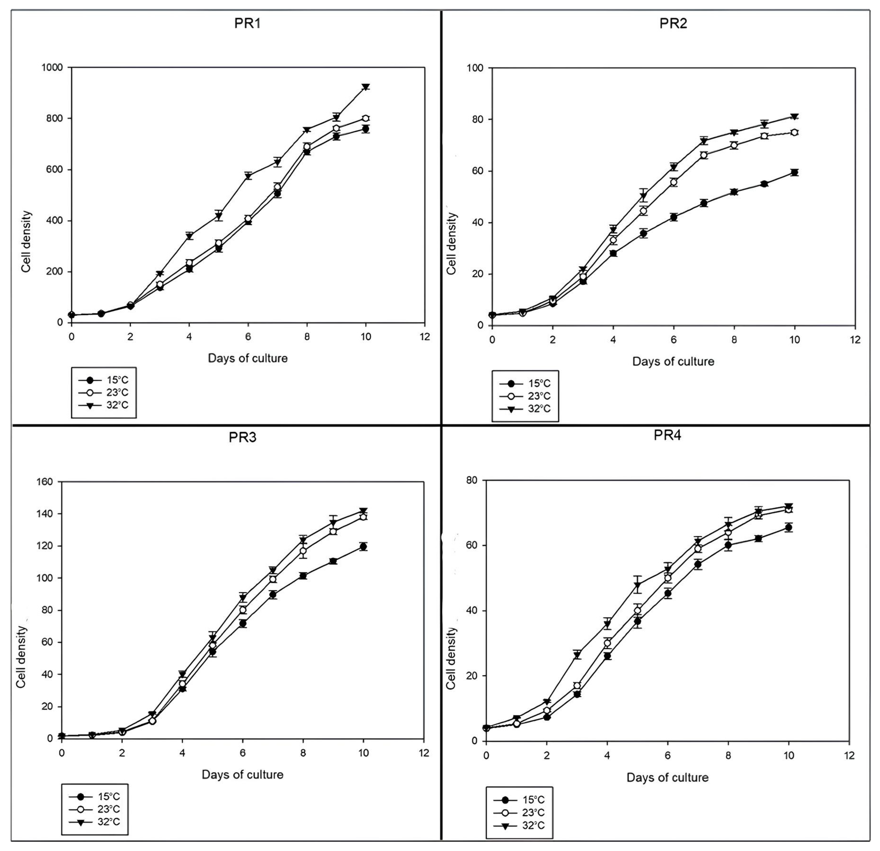 3.3. Growth Evaluation and Kinetics Measurements Under Different Temperature Regimes