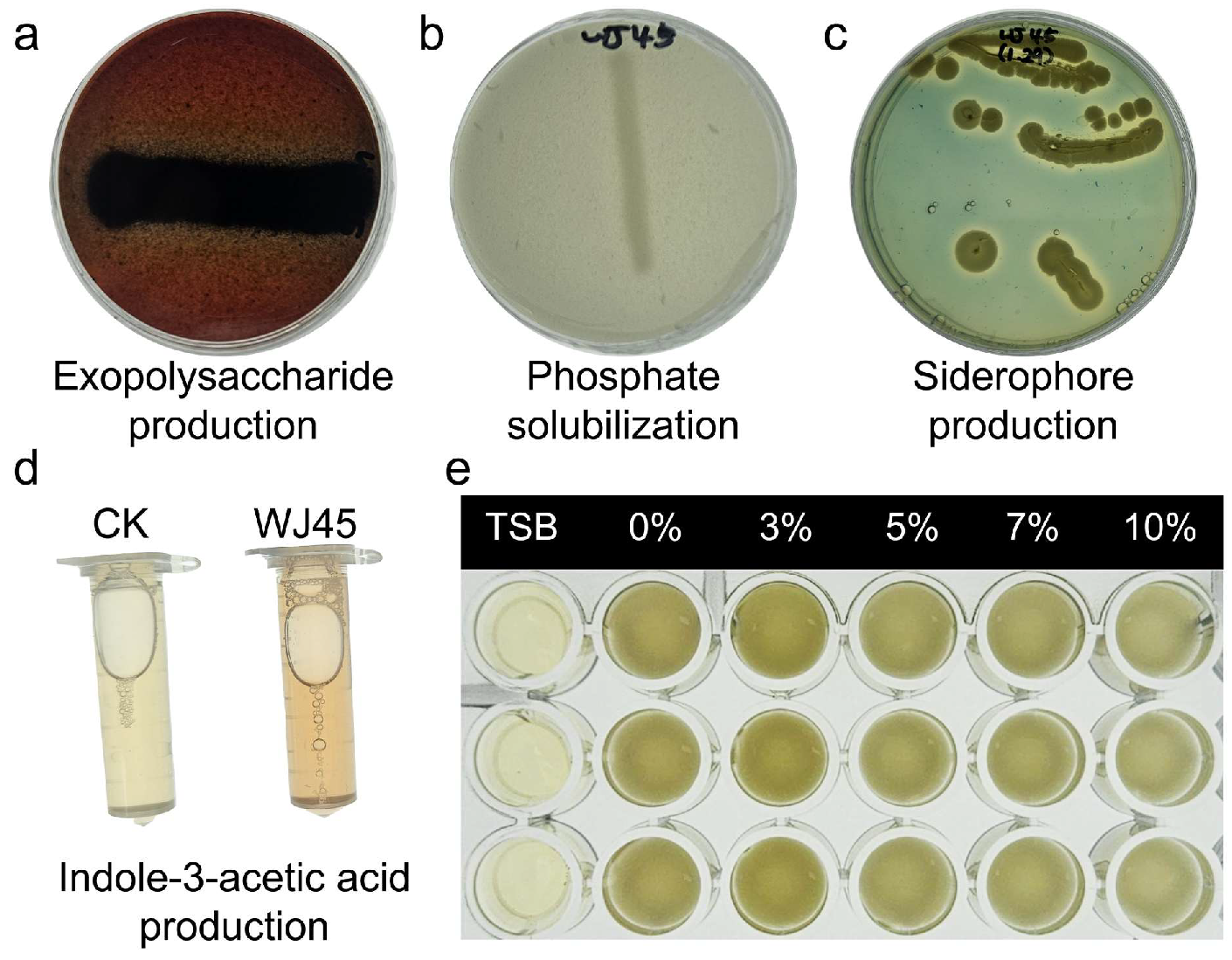 - Indole-3-acetic acid (IAA) production was assessed using culture supernatants obtained after incubation in TSB for 72 h. The supernatant was mixed with Salkowski’s reagent and incubated for 30 min. The development of a pinkish-red coloration was considered indicative of IAA production [22].