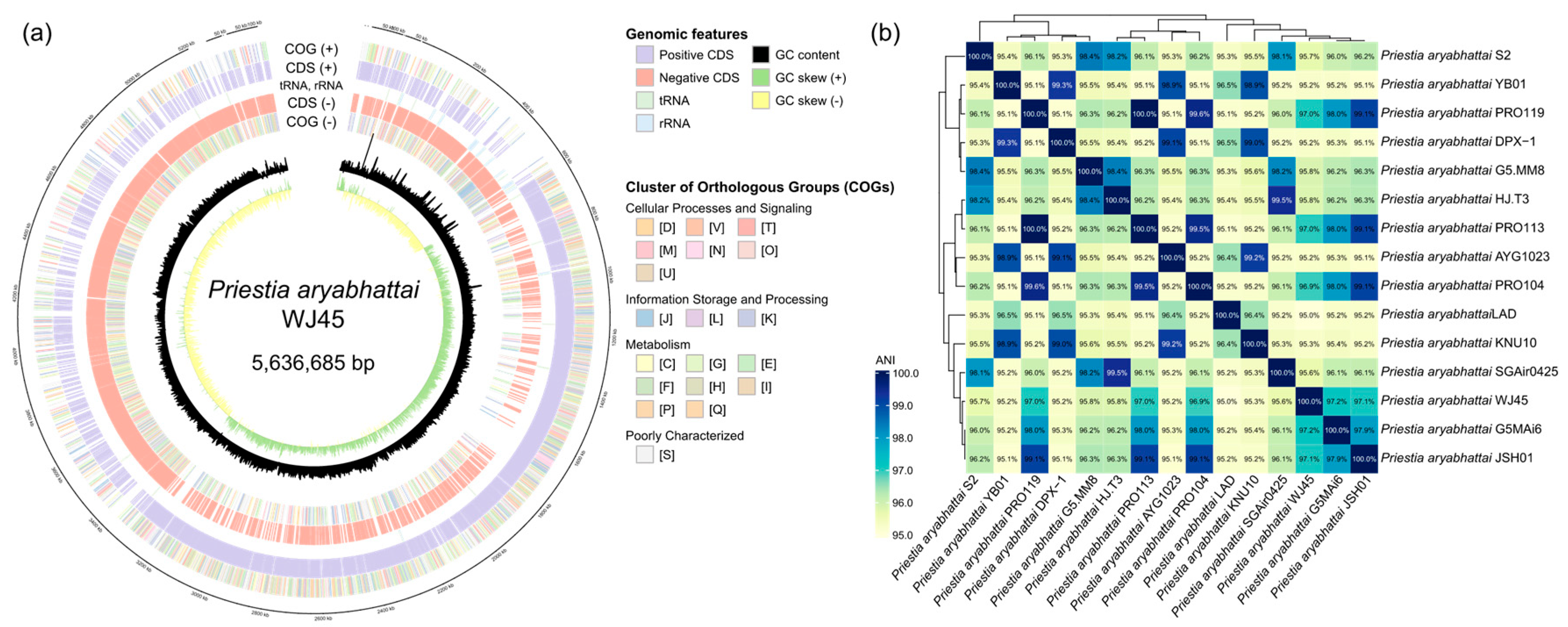 Chicago/Turabian StyleWoo, Ji-In, Min Young Back, Ho-Jun Gam, Ju-Yeon Ha, Sang-Mo Kang, and In-Jung Lee. 2026. "Whole-Genome Analysis of Priestia aryabhattai WJ45 Reveals a Genetic Repertoire Associated with Enhanced Wheat Germination and Early Seedling Growth Under Salt Stress" Microorganisms 14, no. 3: 605. https://doi.org/10.3390/microorganisms14030605