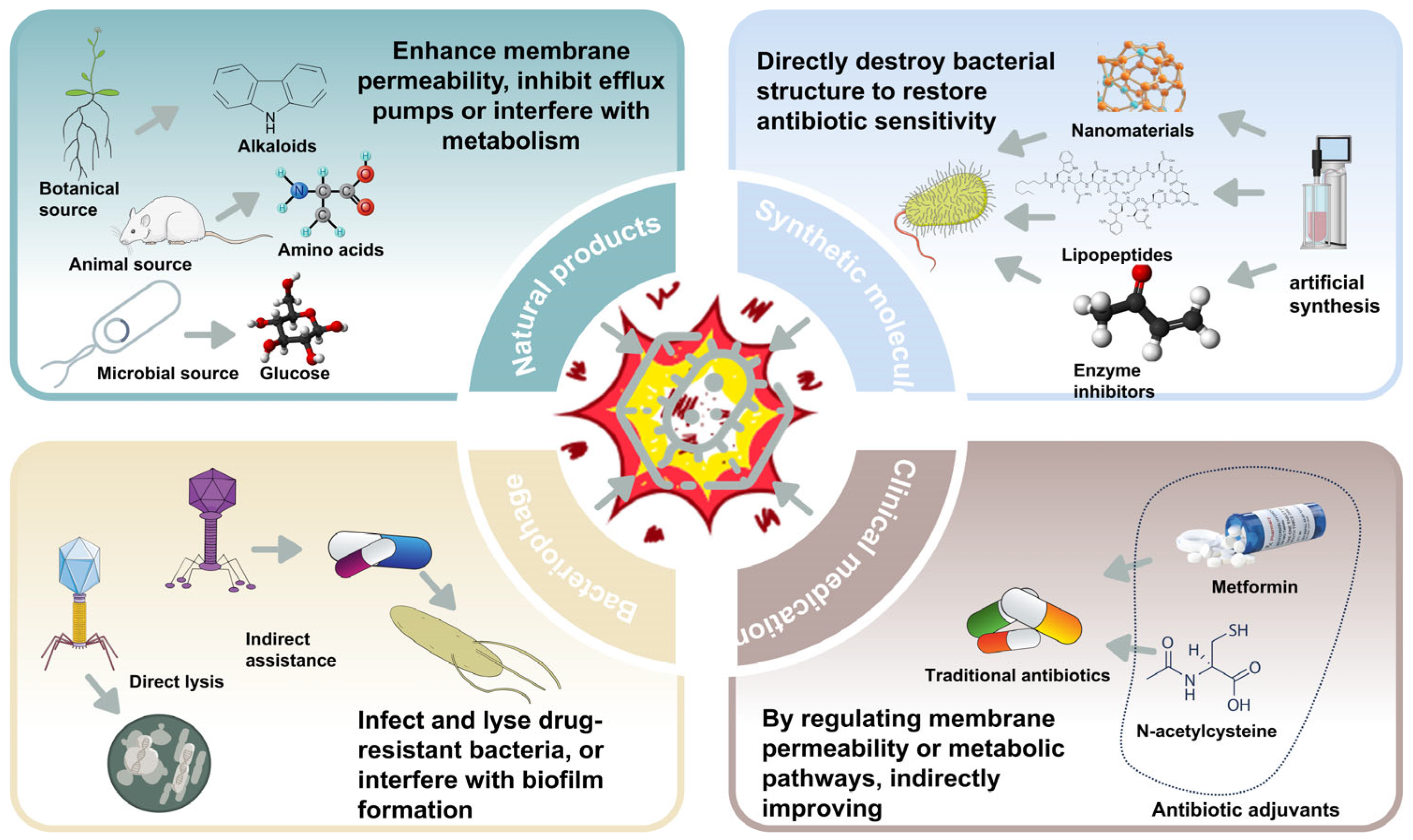 | Examples | Berberine, Matrine, Flavonoids | L-lysine, Melatonin, Antimicrobial peptides | Glucose, Mannitol, Fructose | Silver nanoparticles, Chitosan | dUSTBP8, Nisin | vB_3530, vB_1086 | N-acetylcysteine, Metformin, Oxyclozanide |