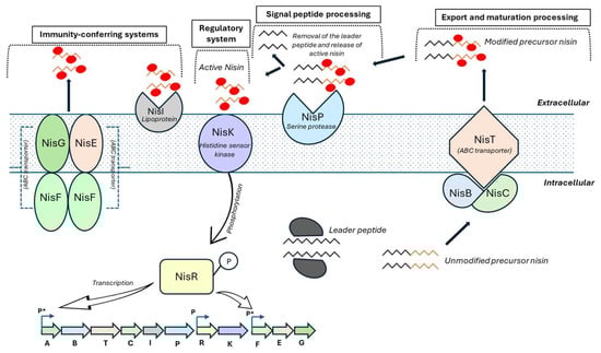 The regulatory system controlling nisin production has been extensively characterized in Lb. lactis. Expression of the nisin operon (nisABTCIPRK) is regulated in a cell density-dependent manner and responds to extracellular nisin concentrations. The two-component regulatory system consists of the histidine kinase NisK and the response regulator NisR. At low nisin concentrations, NisR remains inactive in its dephosphorylated state. NisA, the nisin precursor peptide, undergoes dehydration by NisB and cyclization by NisC. The protease NisP cleaves the N-terminal leader peptide to generate mature nisin, which is then exported from the cell by the ABC transporter NisT. When the extracellular nisin reaches a threshold concentration, it activates the intracellular domain of NisK, leading to the phosphorylation of NisR. This phosphorylation cascade induces transcription of the genes required for nisin biosynthesis, as well as immunity genes that protect the producing strain from its own bacteriocin, including nisI and the ABC transporter genes nisGEF (Figure 2).