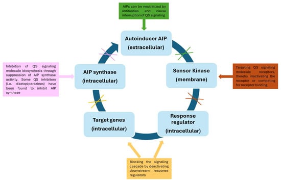 There are several strategies that can be used to inhibit QS mechanisms, such as: (i) suppression of autoinducer synthesis by using molecules that interfere with the activity of the enzymes responsible for their production or that inhibit the expression of the genes encoding these enzymes; (ii) destruction of signaling molecules once they are released into the extracellular environment, through the use of quorum quenching (QQ) enzymes; (iii) blockage of the signaling molecules’ receptors [103] (Figure 3).