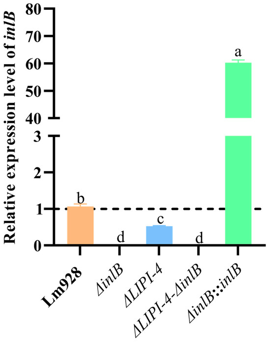 To investigate the functional relationship between inlB and LIPI-4, we constructed in-frame deletion mutants (ΔinlB and ΔLIPI-4-ΔinlB) and a chromosomal complementation strain (ΔinlB::inlB). Successful construction of all strains was confirmed by PCR (Figures S1 and S2). The five strains were cultured at 37 °C with shaking at 160 rpm, and total RNA was extracted for qPCR analysis (Figure 1). Compared with the wild-type Lm928, the inlB transcripts in ΔinlB and ΔLIPI-4-ΔinlB were undetectable, indicating successful knockout of the inlB gene. It is worth noting that the inlB mRNA level of ΔLIPI-4 decreased to 0.53-fold of that in Lm928 (p < 0.05). In contrast, the inlB mRNA level in the complemented strain ΔinlB::inlB was significantly higher than that in Lm928 (p < 0.05).