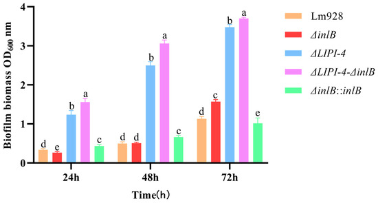 Effects of LIPI-4 and inlB on the biofilm formation ability of Lm. The five strains were adjusted to the same optical density, inoculated into a 48-well plate, and incubated statically at 37 °C for 24, 48, and 72 h. Biofilm formation was then quantified by crystal violet staining followed by OD measurement. Values are presented as mean ± SEM of three biological independent replicates. Different letters indicate significant differences (p < 0.05, Tukey’s HSD test).
