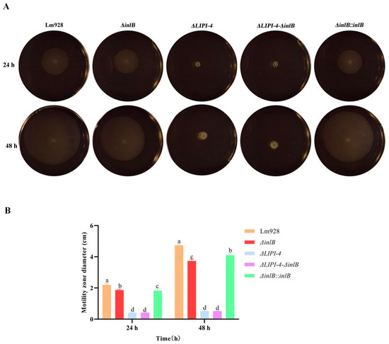 Bacterial motility was assessed on semi-solid medium at 28 °C (Figure 4). After 24 h and 48 h of incubation, similar motility patterns were observed. ΔLIPI-4 and the double mutant ΔLIPI-4-ΔinlB exhibited the smallest migration zones, with no significant difference between them (p > 0.05). ΔinlB and its complemented strain ΔinlB::inlB showed intermediate motility, both significantly lower than Lm928 (p < 0.05); although a statistical difference was detected between these two strains, they behaved similarly.