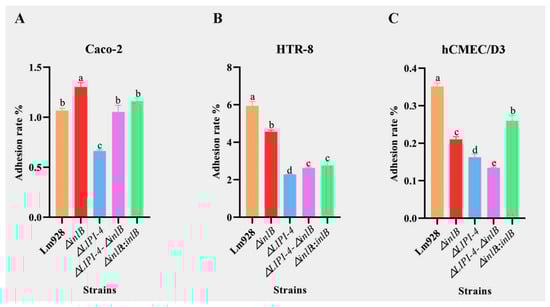 Adhesion of Lm in Caco-2 (A), HTR-8 (B), and hCMEC/D3 cells (C). Adhesion efficiency was determined 1 h post-infection. Values are presented as mean ± SEM of three biological independent replicates. Different letters indicate significant differences (p < 0.05, Tukey’s HSD test).