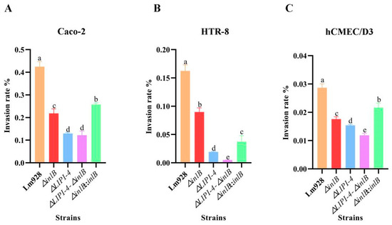 Invasion of Lm in Caco-2 (A), HTR-8 (B), and hCMEC/D3 cells (C). Invasion efficiency was assessed after 2 h of infection (including 1 h of gentamicin treatment to kill extracellular bacteria). Values are presented as mean ± SEM of three biological independent replicates. Different letters indicate significant differences (p < 0.05, Tukey’s HSD test).