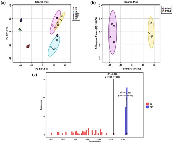 The PT1-2 and PT1-4 groups in the inoculated group showed partial overlap on axis PC1. Statistical analysis of unsupervised models could not visually indicate the differences between the two groups. Therefore, multivariate statistical analysis of the metabolites in the PT1-2 and PT1-4 algae-lysing systems was achieved via OPLS-DA in the full-ion mode for supervised pattern recognition, which effectively eliminated irrelevant influences and screened for differential metabolites. In the unsupervised PCA model, the separation trend was not evident, but the supervised OPLS-DA model achieved better separation results (Figure 3b). After 200 permutation tests, the model exhibited strong fit (R2Y = 0.997) and acceptable predictive ability (Q2 = 0.778). The permuted models consistently showed lower performance than the original model, and model reliability was examined by permutation testing (n = 200; Figure 3c). In the permutation test, none of the permuted models exceeded the original Q2 (0/200), corresponding to an empirical p value of p < 0.005, while 6 out of 200 permuted models reached or exceeded the original R2Y, giving an empirical p value of p = 0.030. Together with the QC clustering in PCA, these results support stable measurement performance and justify using the OPLS-DA output as a variable-screening aid for distinguishing PT1-2 from PT1-4.