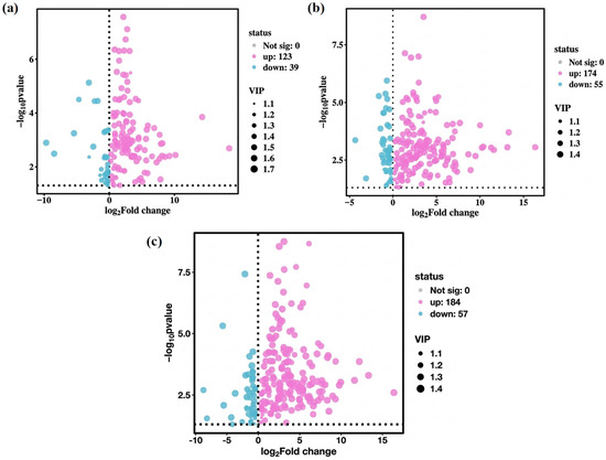 Owing to the high dimensionality and correlation among variables in metabolite data, multivariate statistical analysis methods such as PCA and PLS-DA are commonly used in metabolomic data analyses. These methods perform dimensionality reduction and regression analysis on multidimensional data while retaining the original information to the greatest extent, followed by facilitating the screening and subsequent analysis of differential metabolites. As shown in Figure 6a–c, 298 differential metabolites were screened in this study, including 162 between PT1_0 and C0, with 123 upregulated and 39 downregulated; 229 between PT1_2 and C2, with 174 upregulated and 55 downregulated; and 241 between PT1_4 and C4, with 184 upregulated and 57 downregulated.
