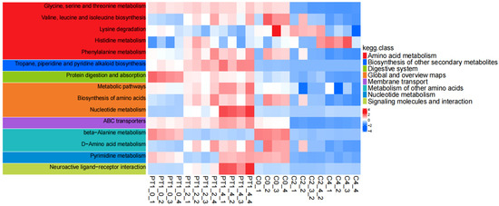 According to the KEGG enrichment analysis results of PT1 and the control group (C), the differential metabolites were mainly enriched in pathways related to amino acid and nucleotide metabolism (Figure 9). Among all enriched functions, “metabolic pathways” had the highest number of differential metabolites, but its Rich factor was relatively low, suggesting that this functional pathway reflects a broader “global metabolic pathway”-level enrichment. In contrast, the glycine/serine/threonine metabolism, valine/leucine/isoleucine biosynthesis, ABC transporter, and nucleotide-related metabolic pathways exhibited higher degrees of enrichment, often with higher significance; some pathways, such as phenylalanine metabolism and tropane/piperidine/pyridine alkaloid biosynthesis, showed relatively weaker significance but still had certain enrichment signals.