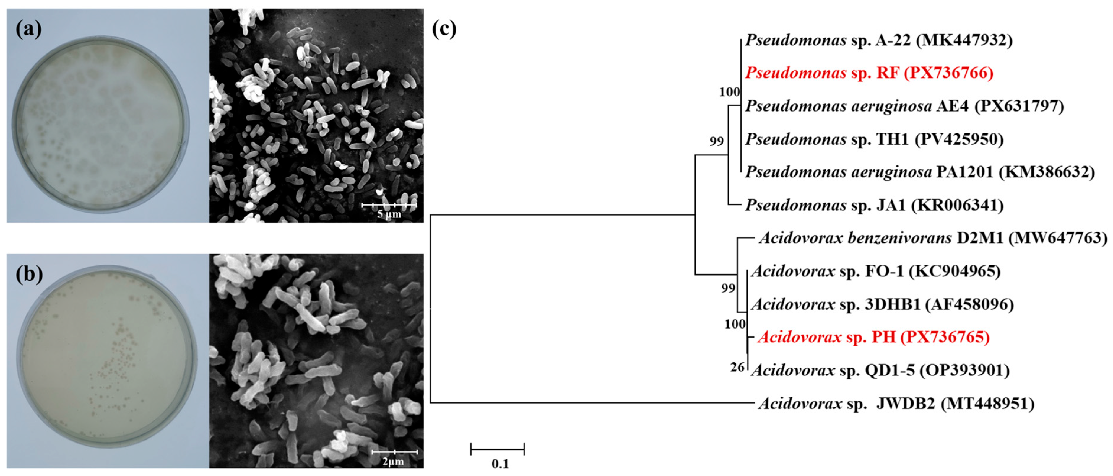 - Bedics, A.; Tancsics, A.; Banerjee, S.; Toth, E.; Harkai, P.; Gottschall, G.G.; Boka, K.; Kriszt, B. Acidovorax benzenivorans sp. nov., a novel aromatic hydrocarbondegrading bacterium isolated from a xylene- degrading enrichment culture. Int. J. Syst. Evol. Microbiol. 2024, 74, 006219. [Google Scholar] [CrossRef]