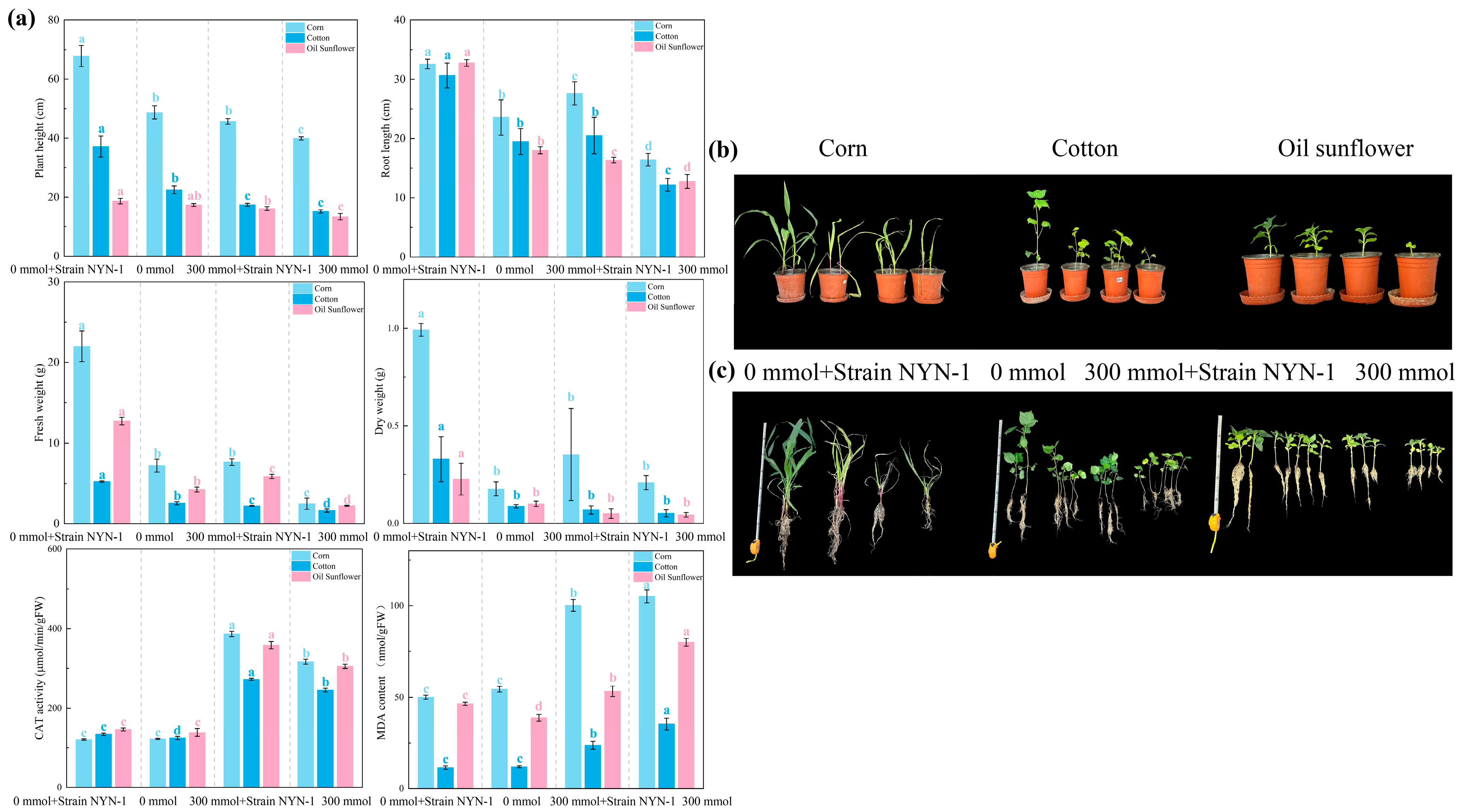 3.3. Growth-Promoting Effects of S. succinus NYN-1 on Maize, Cotton, and Sunflower Under Salt Stress