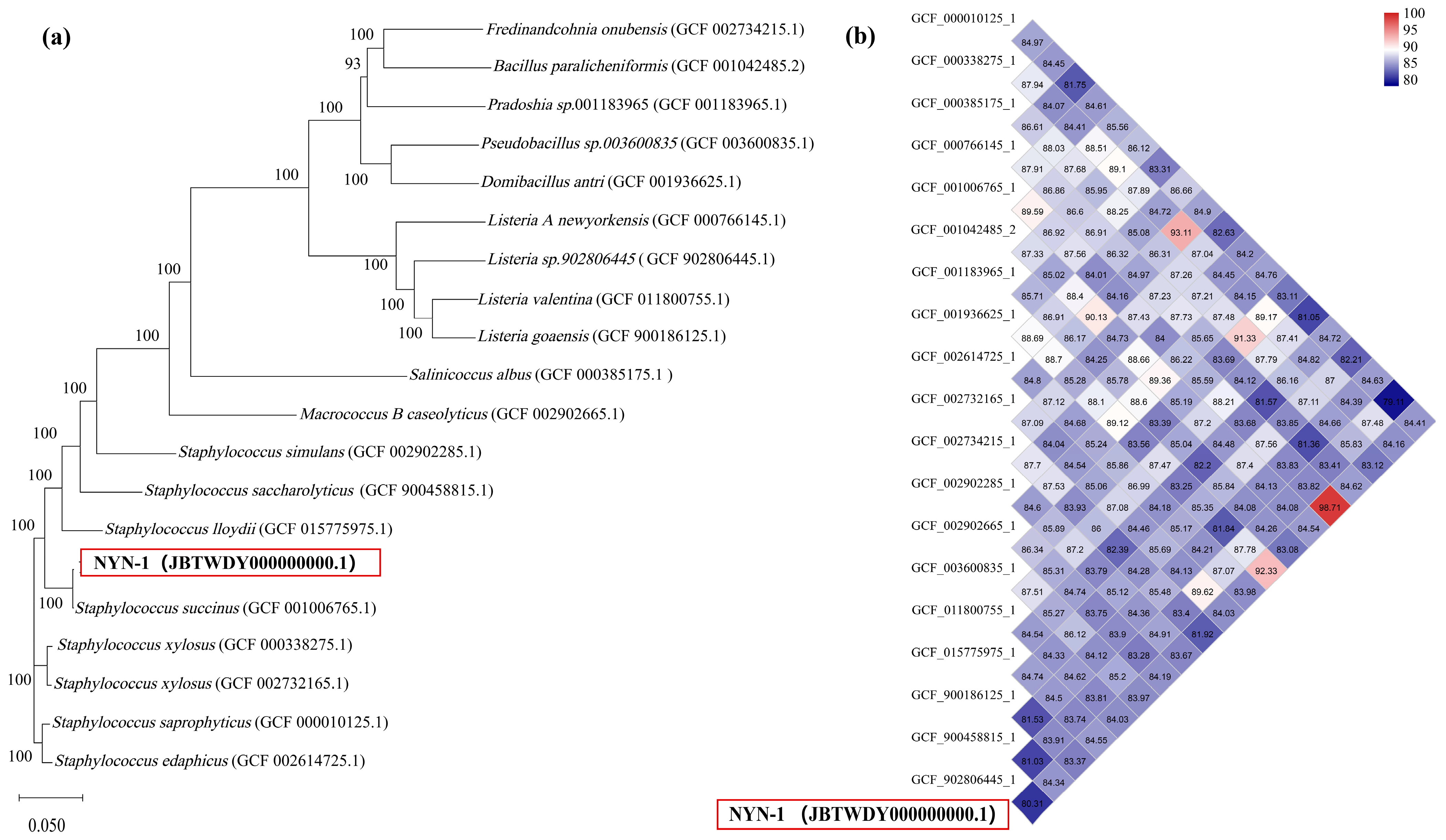 Chicago/Turabian StyleHuang, Yuxiang, Jingyi Wang, Jinzhu Song, and Qi Wang. 2026. "Phenotypic, Pot-Experimental, and Genomic Characterization of Staphylococcus succinus NYN-1, a Moderately Halophilic Bacterium Isolated from the Rhizosphere of the Halophyte Suaeda dendroides in Xinjiang" Microorganisms 14, no. 3: 680. https://doi.org/10.3390/microorganisms14030680