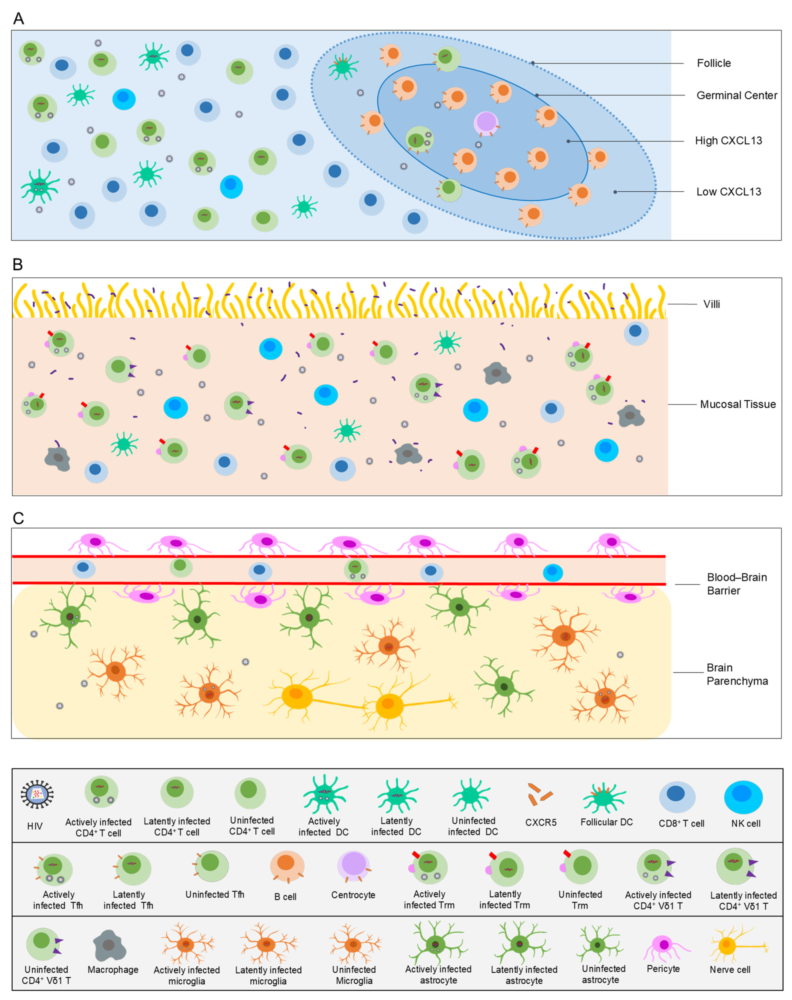 - Fukazawa, Y.; Lum, R.; Okoye, A.A.; Park, H.; Matsuda, K.; Bae, J.Y.; Hagen, S.I.; Shoemaker, R.; Deleage, C.; Lucero, C.; et al. B cell follicle sanctuary permits persistent productive simian immunodeficiency virus infection in elite controllers. Nat. Med. 2015, 21, 132–139. [Google Scholar] [CrossRef]