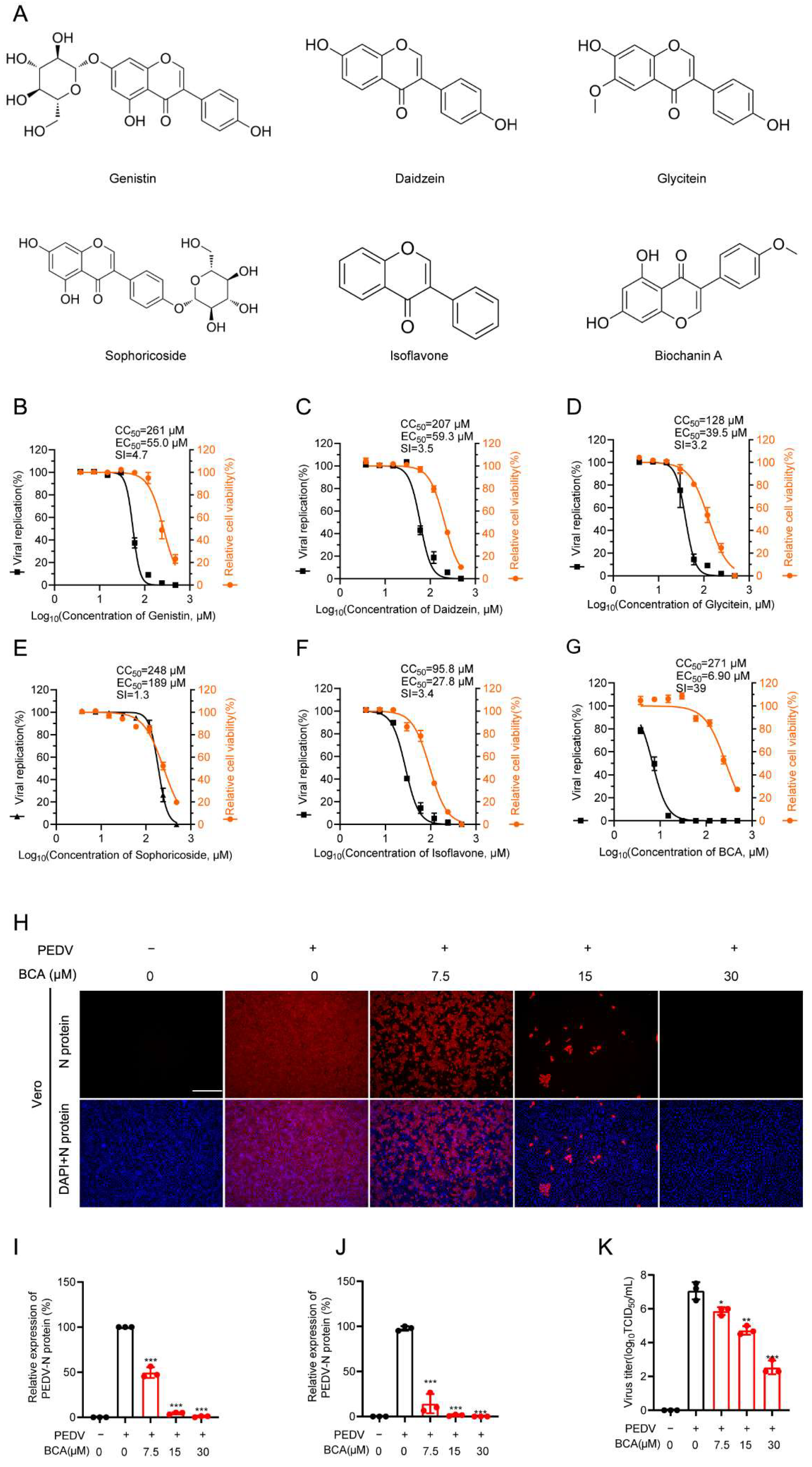 3.1. Biochanin A (BCA) Exhibits Potent Anti-PEDV Activity In Vitro
