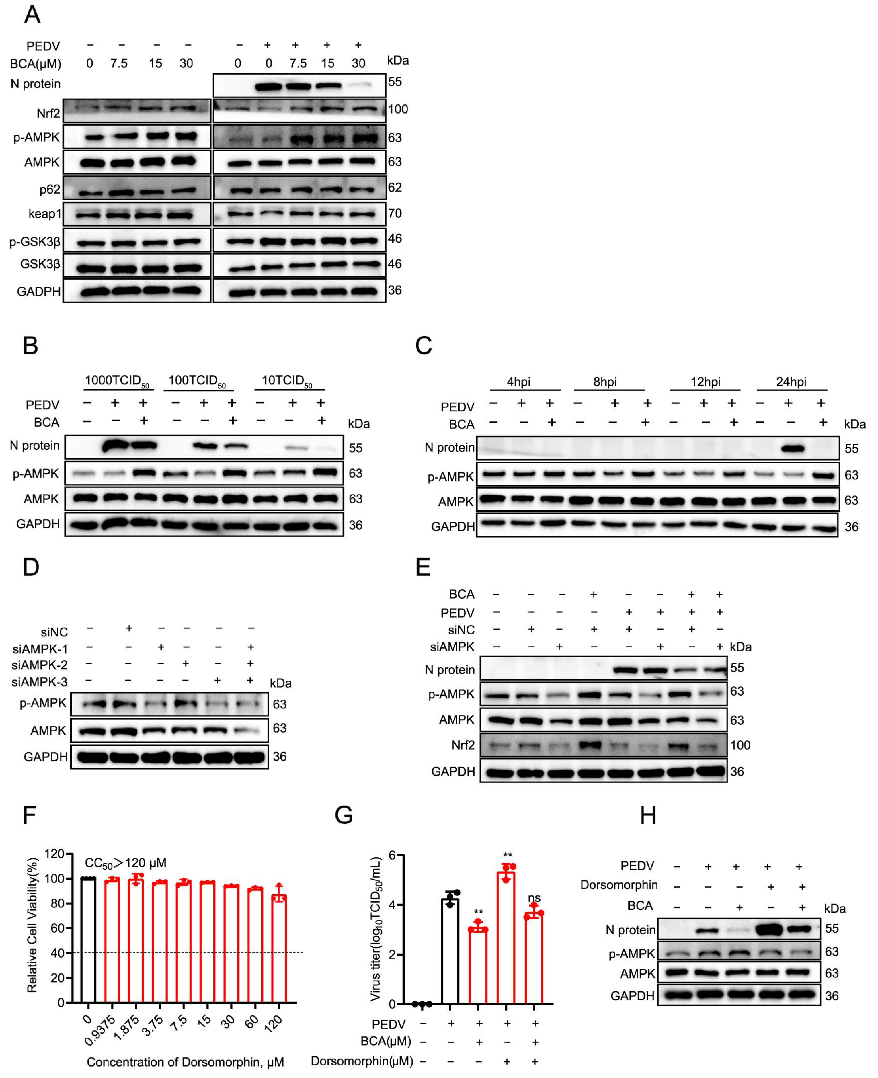 3.6. BCA Upregulates the AMPK/Nrf2 Signaling Pathway to Suppress PEDV Replication