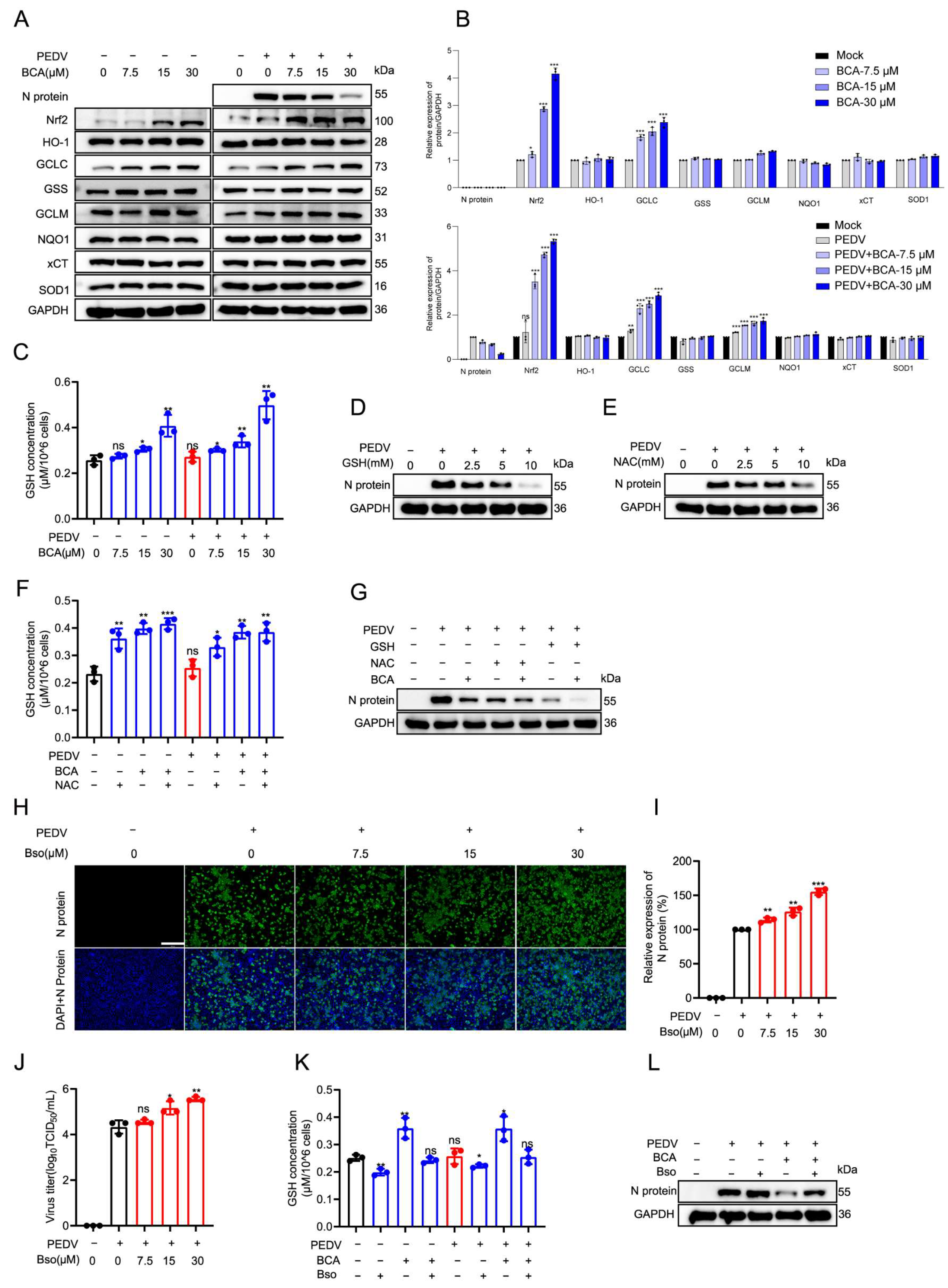 3.7. BCA Inhibits PEDV Replication Through Nrf2-Mediated Glutathione Biosynthesis