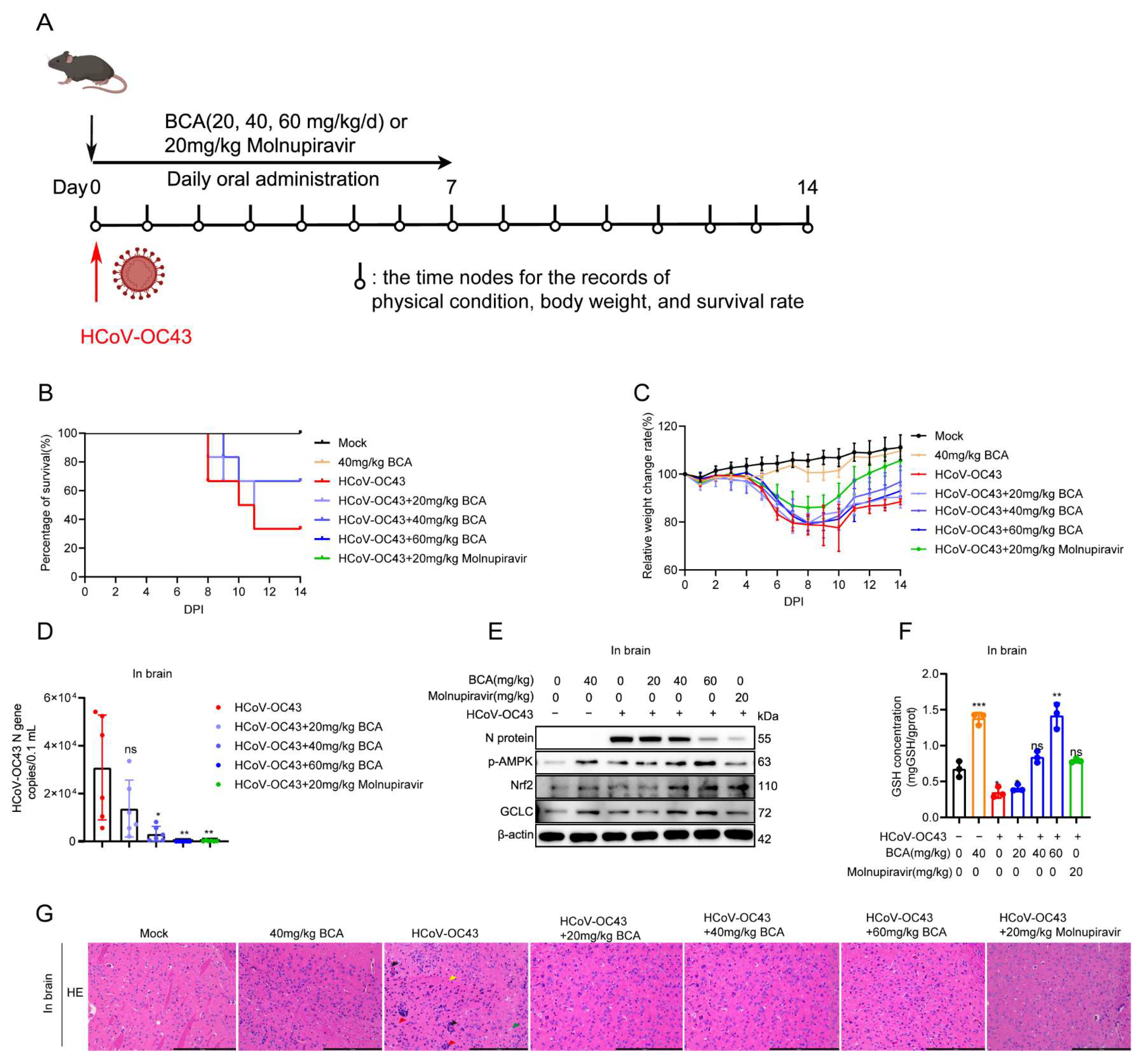 3.8. Oral Administration of BCA Upregulates the AMPK/Nrf2 Signaling Pathway In Vivo Provides Significant Protection Against HCoV-OC43 Infection in Mice