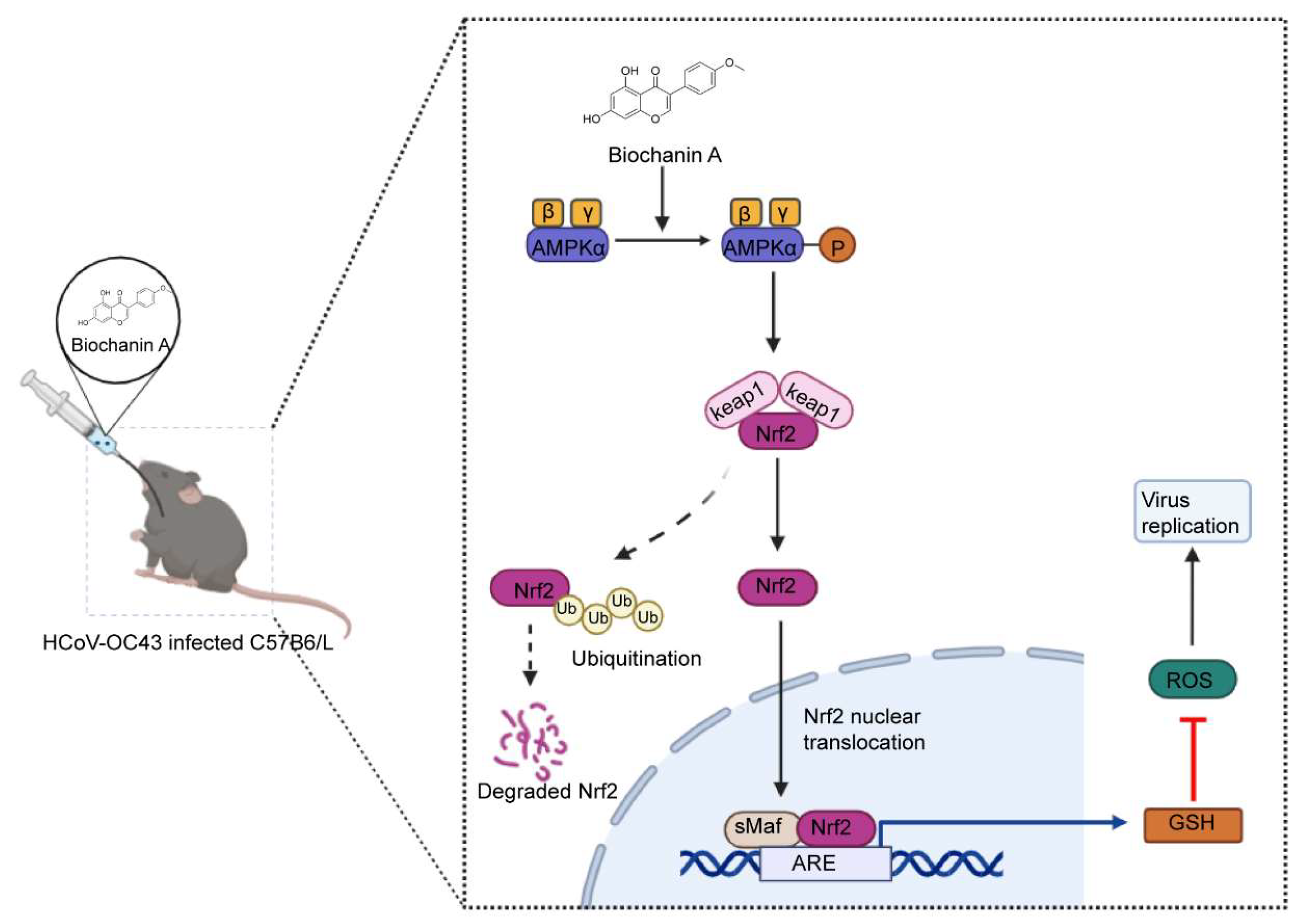 Chicago/Turabian StyleLin, Qisheng, Fan Ji, Haiyan Shen, Jiajing He, Donglan Liu, Fang Li, Ziyu Cheng, Weisan Chen, Fengxiang Zhang, Zifeng Yang, and et al. 2026. "Biochanin A Exerts Broad-Spectrum Antiviral Activity Against Coronaviruses via Activating the AMPK/Nrf2/GSH Pathway" Microorganisms 14, no. 4: 851. https://doi.org/10.3390/microorganisms14040851