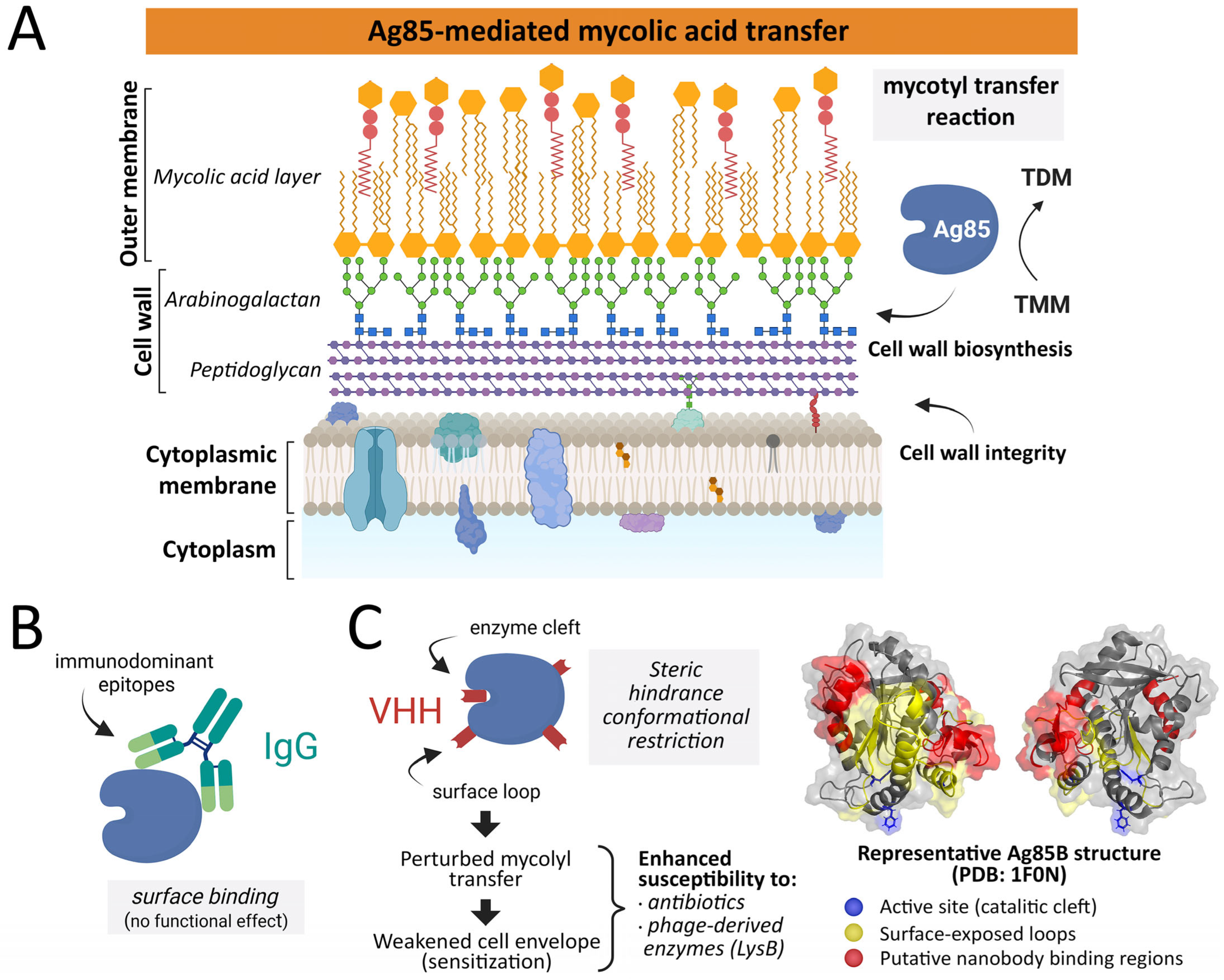 | Tetrahydrolipstatin (THL, Orlistat) | Ag85A and Ag85C | Covalent binding to catalytic serine in active site | Blocks mycolyl transfer reactions; reduces mycolate incorporation | Structural data confirm active-site targeting and covalent inhibition | Provides reference for direct catalytic inhibition; contrasts with potential steric/allosteric nanobody effects | [8] |