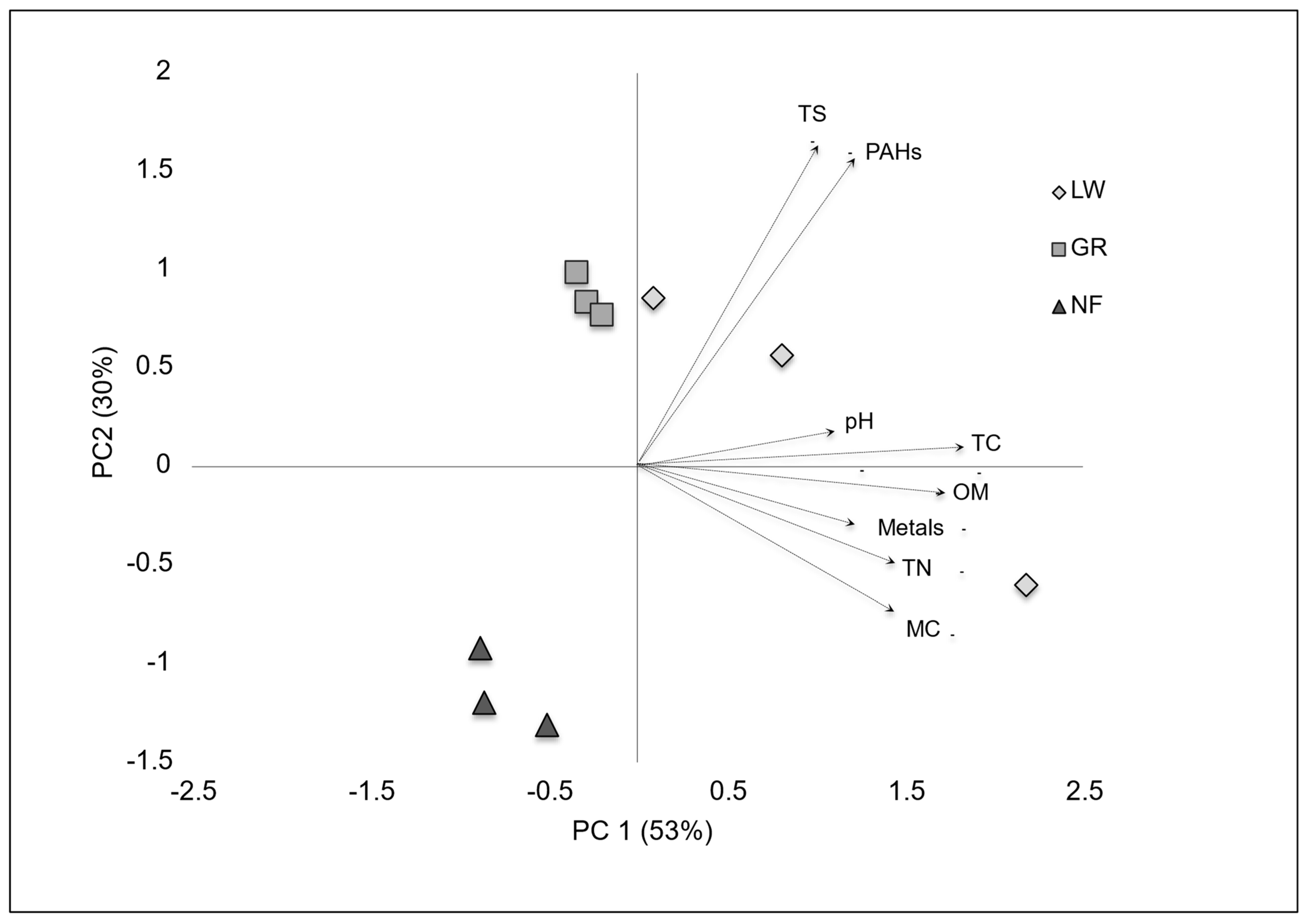 - Johnston, G.; Leff, L. Bacterial community composition and biogeochemical heterogeneity in PAH-contaminated riverbank sediments. J. Soils Sediments 2015, 15, 225–239. [Google Scholar] [CrossRef]
