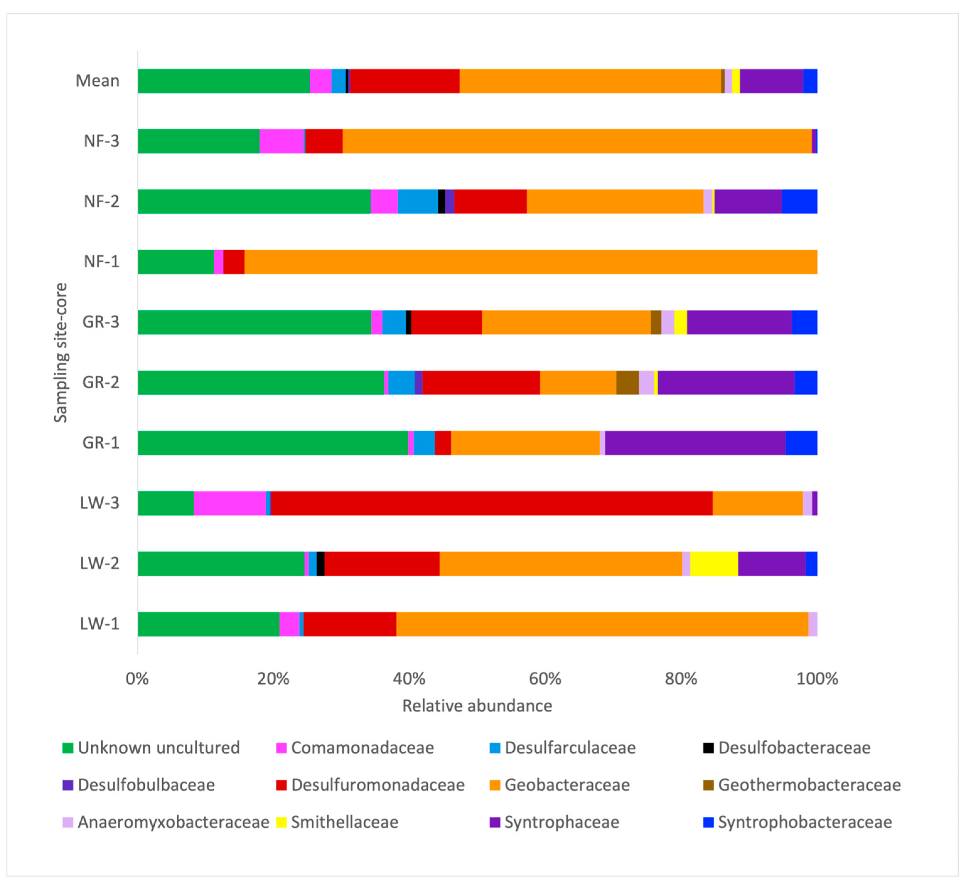 - Holmes, D.; Finneran, K.; O’Neil, R.; Lovley, D. Enrichment of members of the family Geobacteraceae associated with stimulation of dissimilatory metal reduction in uranium-contaminated aquifer sediments. Appl. Environ. Microbiol. 2002, 68, 2300–2306. [Google Scholar] [CrossRef]