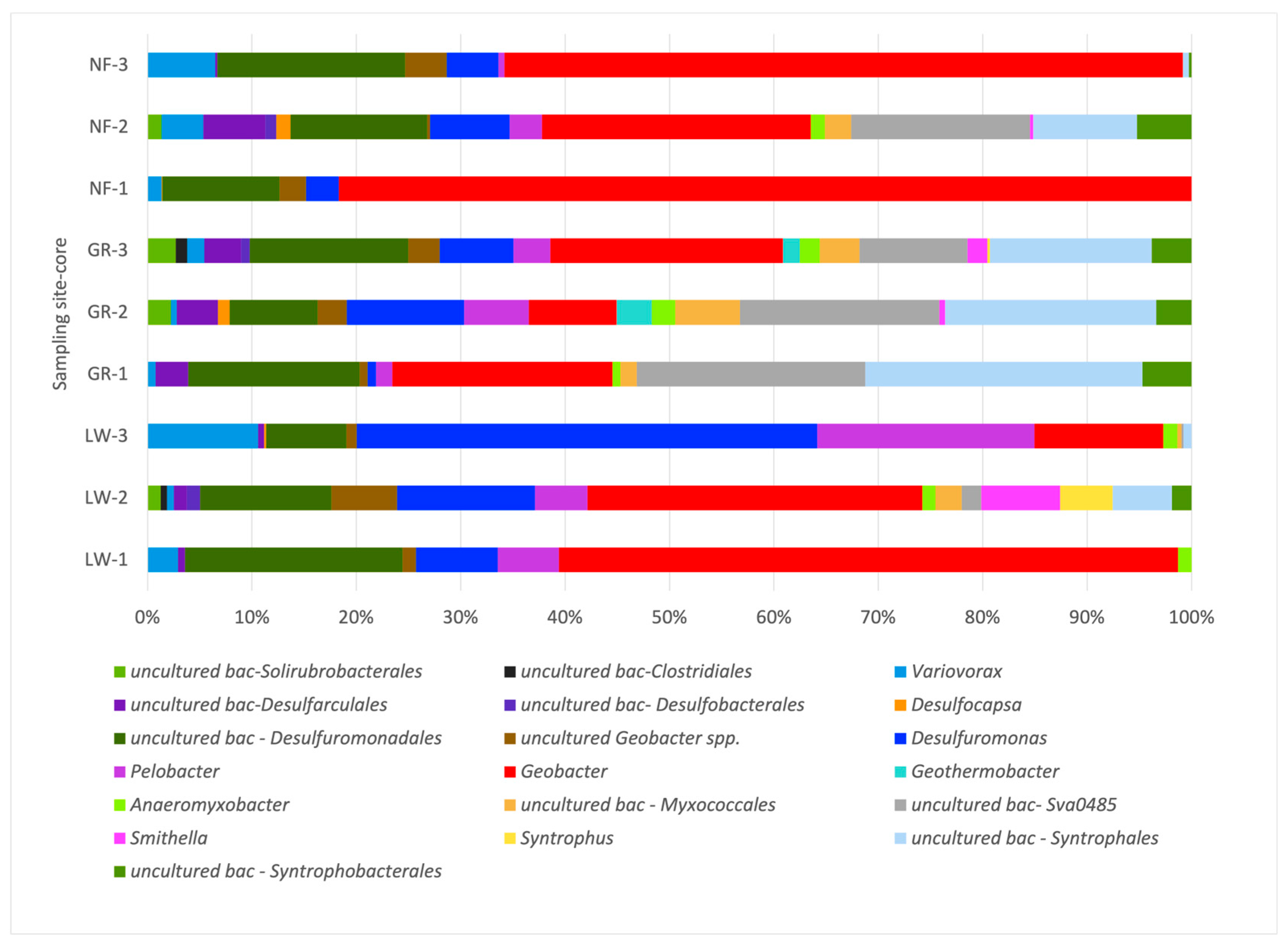 - Bravo, A.G.; Zopfi, J.; Buck, M.; Xu, J.; Bertilsson, S.; Schaefer, J.K.; Poté, J.; Cosio, C. Geobacteraceae are important members of mercury-methylating microbial communities of sediments impacted by wastewater releases. ISME J. 2018, 12, 802–812. [Google Scholar] [CrossRef]
