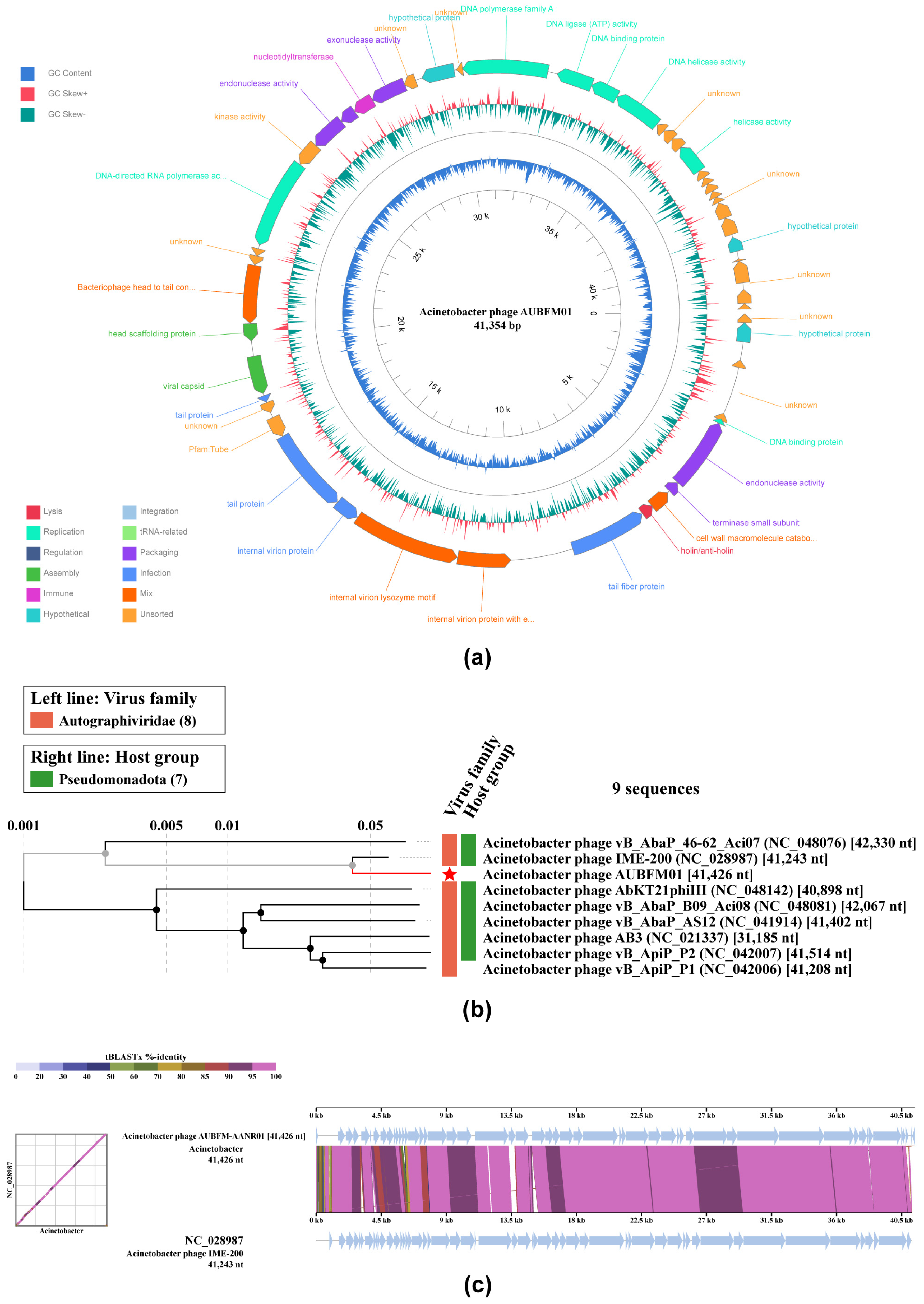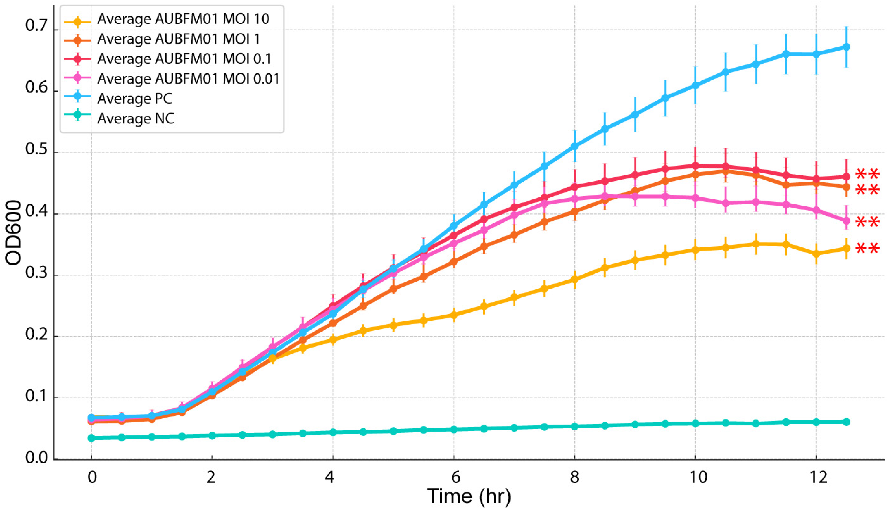 3.1. Isolation, Plaque Morphology, and Host Range of Phage AUBFM01