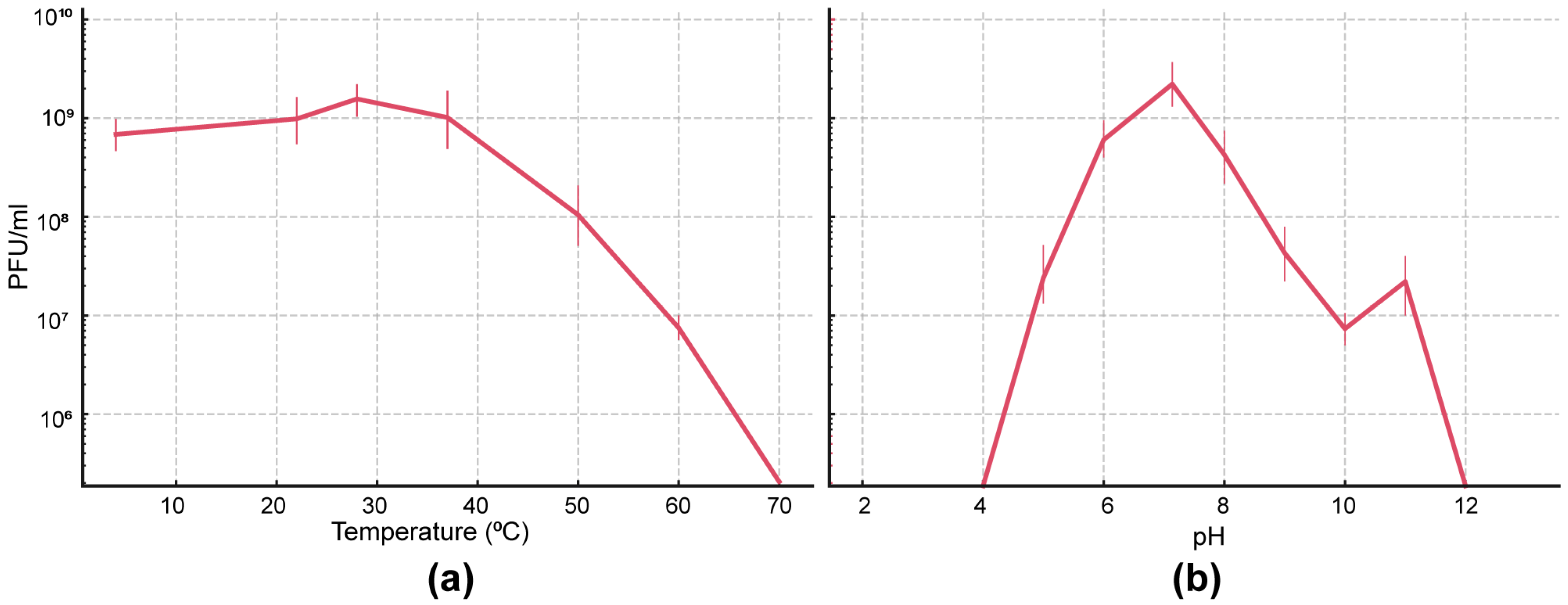 - pH Stability: Phage pH stability was assessed using a working suspension of approximately 108 PFU/mL, prepared by diluting a concentrated phage stock (~1010 PFU/mL) directly into SM buffer previously adjusted to pH values ranging from 2.0 to 13.0. Samples were incubated at 37 °C for 1 h, after which residual viable phage particles were quantified by the double-layer agar method.