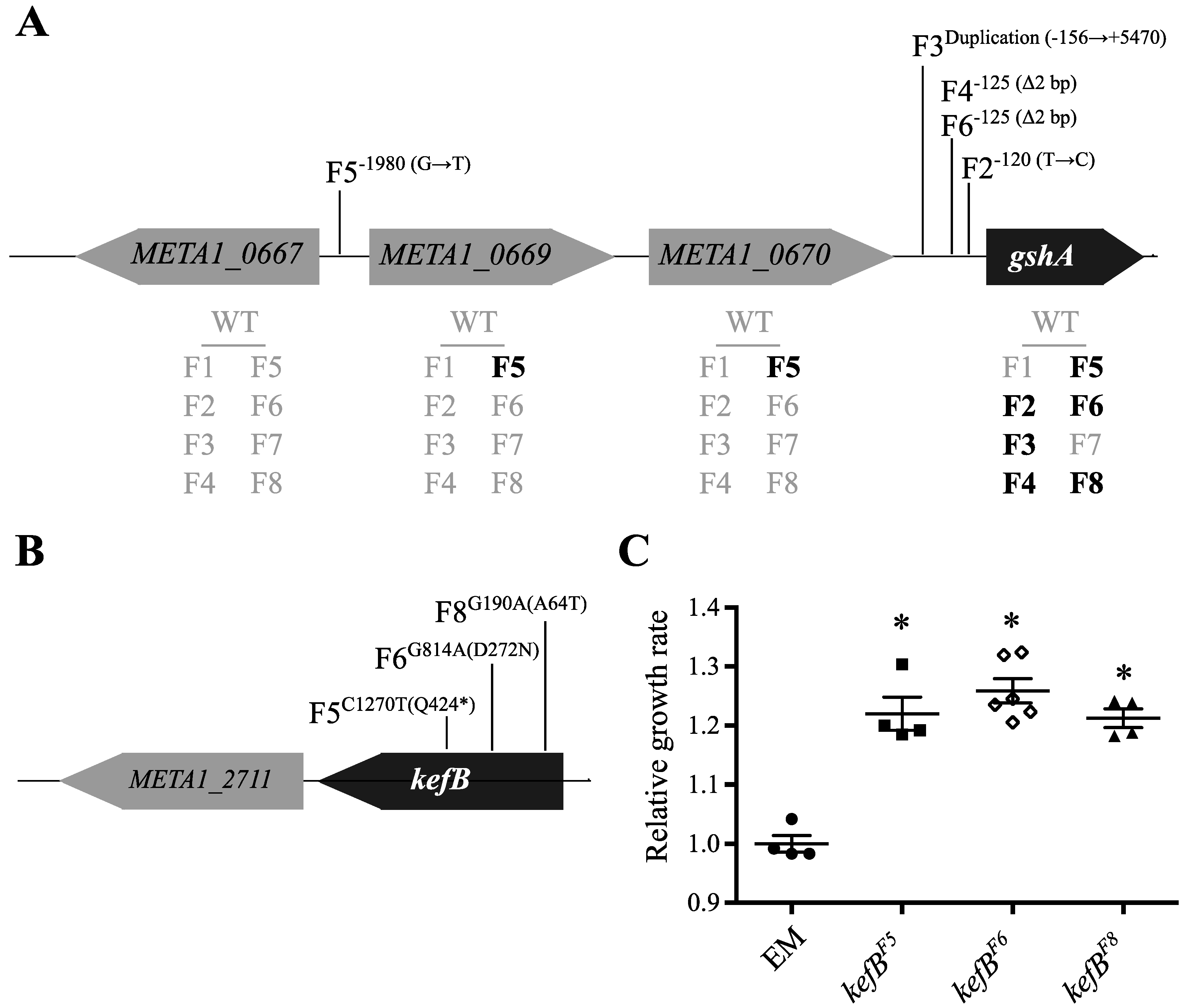 Parallel mutations to gshA and kefB occurred in multiple F lines. (A) Multiple mutations that appear to account for the observed increase in expression of gshA. Shown are evolved gshA alleles and increases in gene expression (bold) from microarray analysis. (B) The kefB locus was also targeted by parallel mutations in multiple F lines, and (C) each evolved allele was found to be beneficial in the EM background grown on methanol. Asterisk (*) indicates p < 0.05 in a two-tailed, unpaired t-test assuming unequal variance.