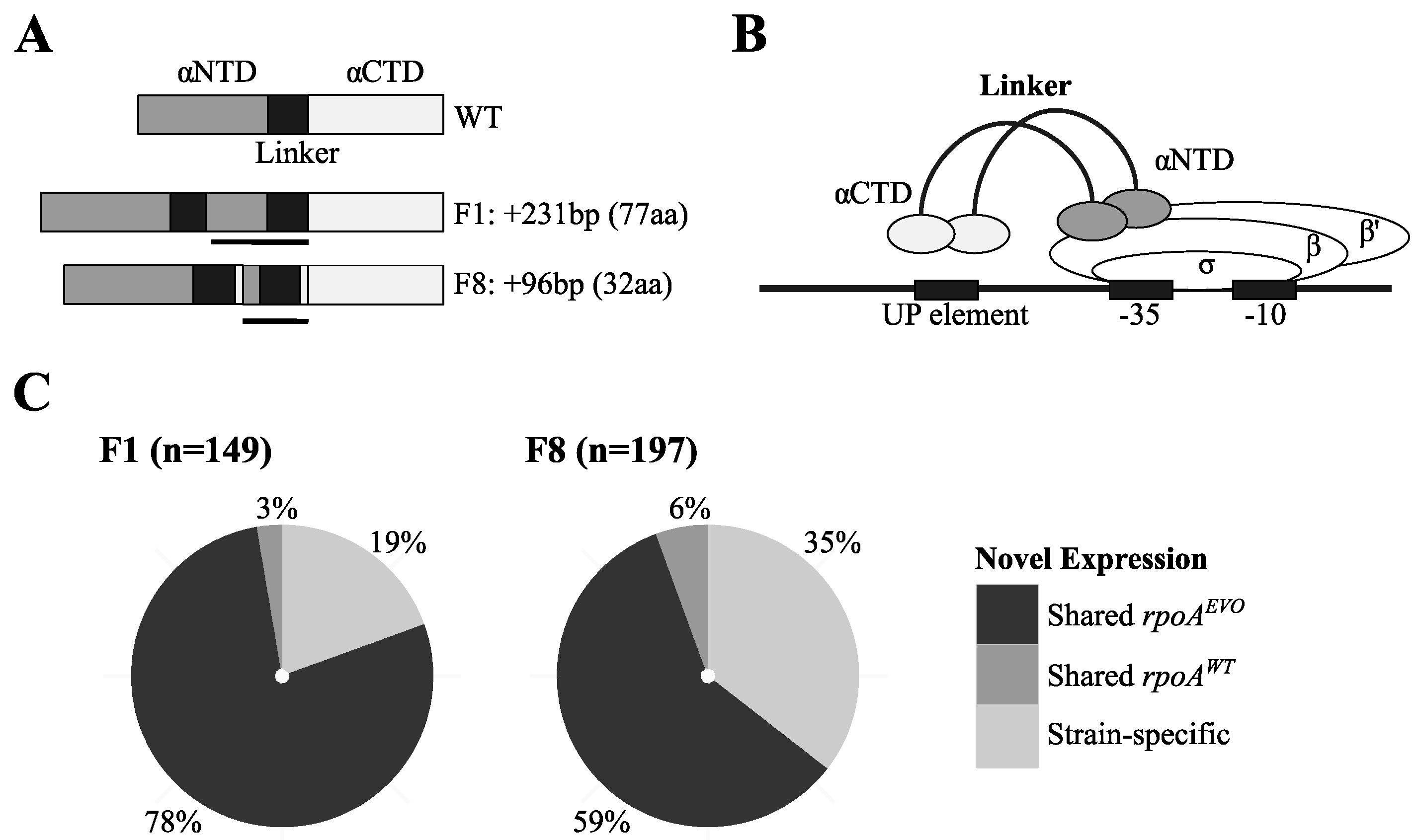 Mutations that extend the RNAP linker are linked to unique gene expression in F1 and F8. (A) Wild-type RpoA consists of αNTD and αCTD domains connected by an unstructured linker. F1 and F8 possess internal sequence duplications (black bar) that are hypothesized to extend both the linker and neighboring domains. (B) Bacterial RNAP is composed of five core subunits. Important to this work are the effects of linker extension mutations on the αNTD and the αCTD, which facilitate binding to DNA and co-regulatory proteins near UP binding sites. Modified from [58]. (C) F1 and F8 have up to 16-fold more genes with “novel” expression [10], most of which are uniquely shared between only these two strains relative to other F strains.
