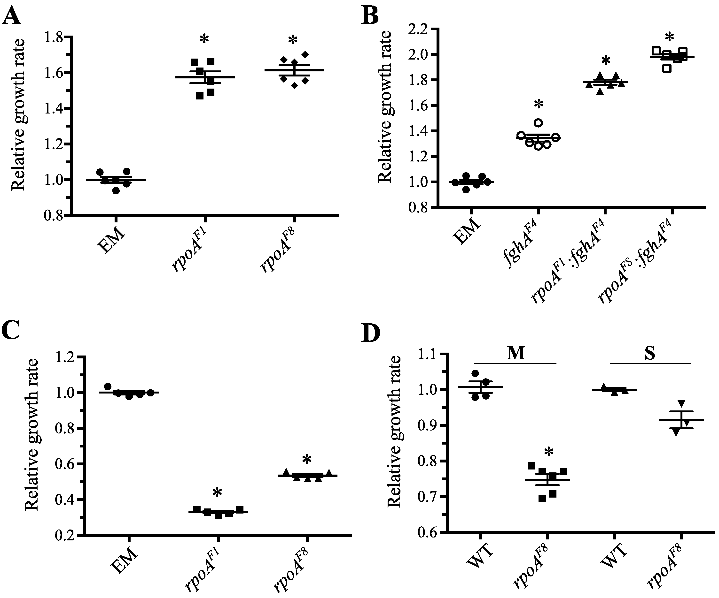 Effect of rpoAEVO across multiple genetic backgrounds and growth conditions. (A) Mutations to rpoA were highly beneficial in the ancestral, EM background. (B) rpoAEVO mutations remained beneficial in presence of beneficial (fghAF4) mutations to the engineered pathway. (C) rpoAEVO mutations were strongly deleterious in EM grown on succinate. (D) The rpoAF8 allele was deleterious in the WT background grown on both methanol and succinate. Repeated attempts to generate a WT strain possessing rpoAF1 failed. Asterisk (*) indicates p < 0.05 in a two-tailed, unpaired t-test assuming unequal variance.