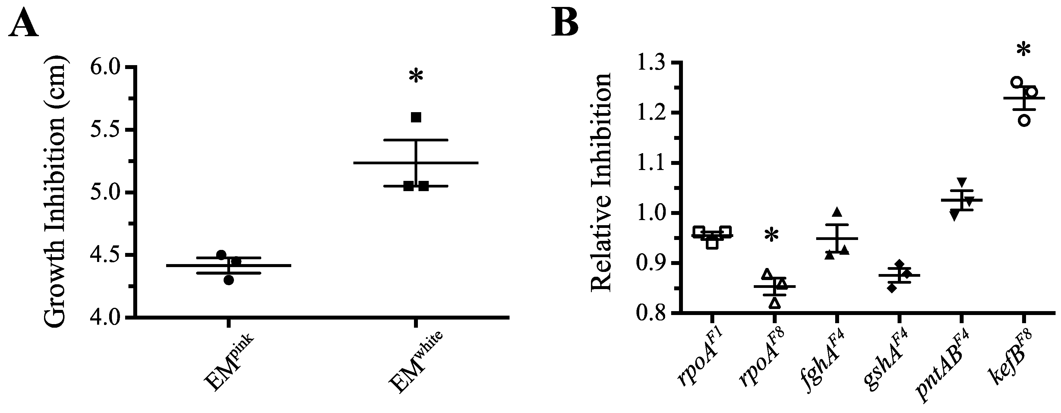 Stress test of rpoA and other mutants grown on methanol plates with hydrogen peroxide. (A) Interestingly, pink and white EM ancestors were not equivalent in these growth conditions, as the pink-pigmented strain with carotenoids was roughly 19% more resistant against hydrogen peroxide. (B) Upon normalizing the growth of mutants to their respective pink/white ancestor, several mutants—including rpoAEVO—offered protection against hydrogen peroxide. Asterisk (*) indicates p < 0.05 in a two-tailed, unpaired t test assuming unequal variance. Note that the gshAF4 allele imparted a marginally insignificant reduction in inhibition (p = 0.056).