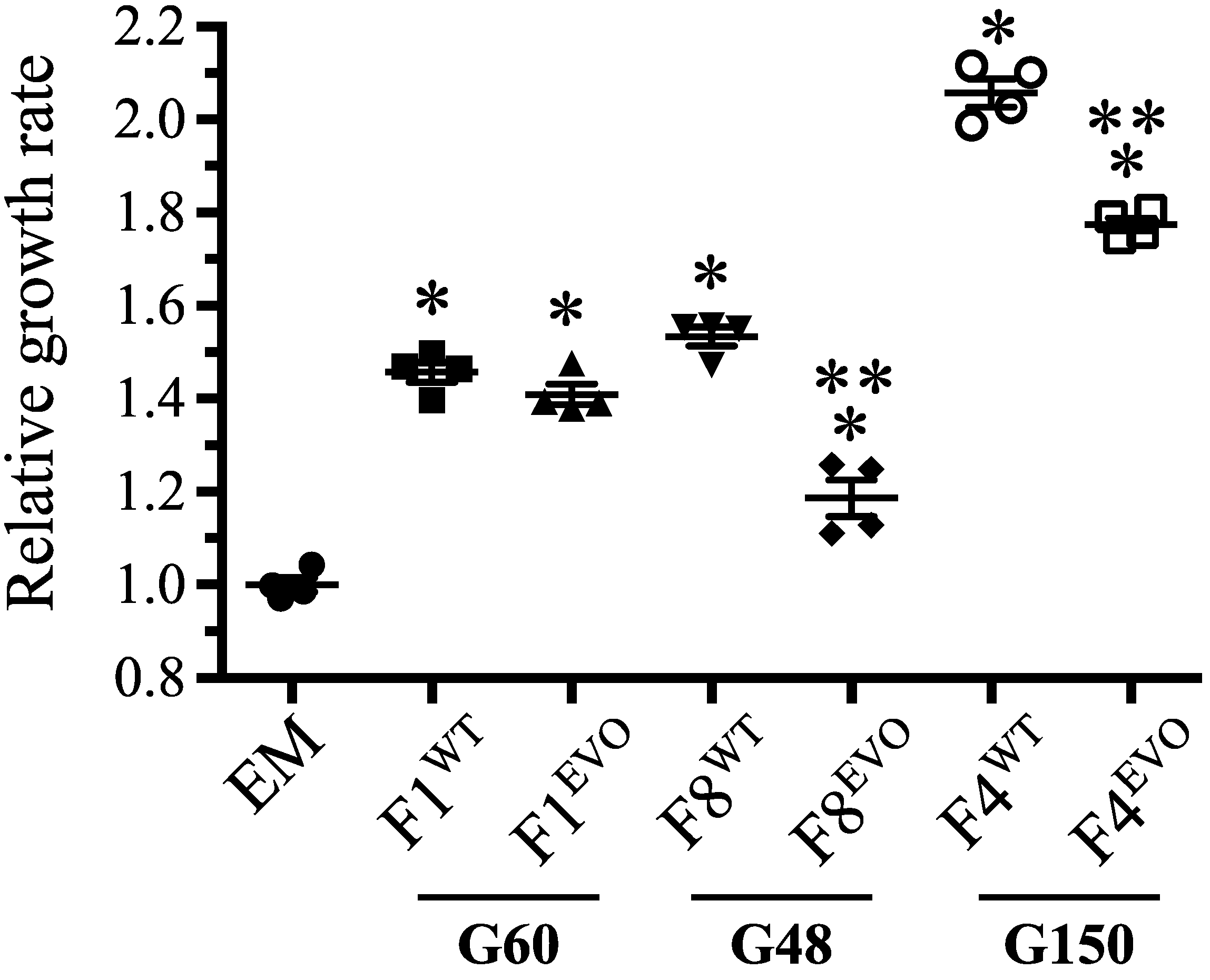 Growth of rpoAEVO and rpoAWT cohorts sampled from early time points of populations F1, F4, and F8. Contemporaneous evolved isolates possessing either rpoAEVO or rpoAWT alleles were isolated from early F populations and assayed for their growth improvements relative to EM on methanol. In all populations, evolved isolates with the rpoAWT clones held a growth advantage over those with rpoAEVO present at the same time point. Single and double asterisks indicate p < 0.05 in a two-tailed, unpaired t test assuming unequal variance in comparing against EM (*) and early isolate cohorts (**), respectively.