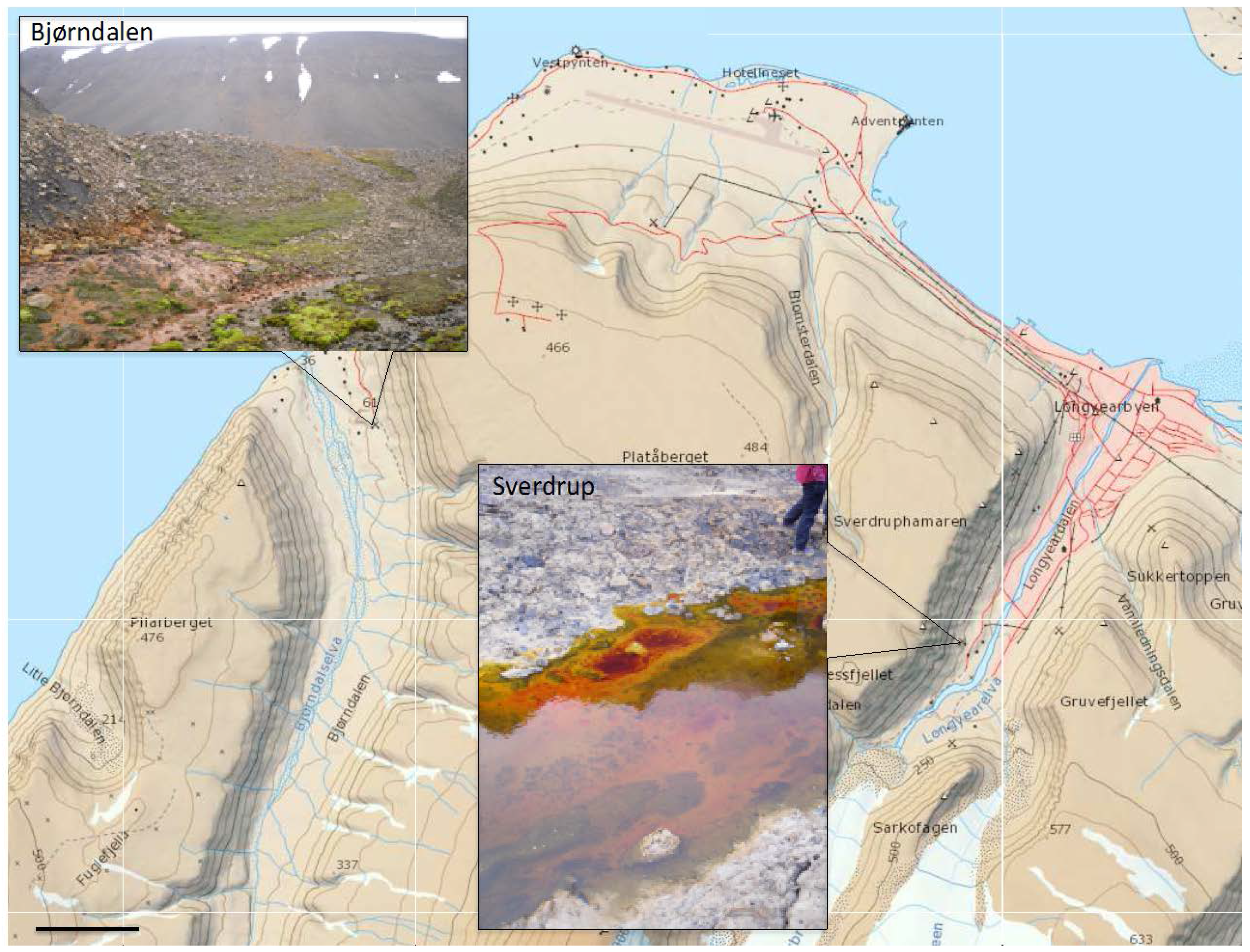 Area map that shows the study sites near Longyearbyen in Svalbard. Scale bar 1 km. Contour interval 50 m. The map was obtained from the Norwegian Polar Institute and it is licensed under the Creative Commons Attribution 4.0 International (CC BY 4.0) license (http://creativecommons.org/licenses/by/4.0/).
