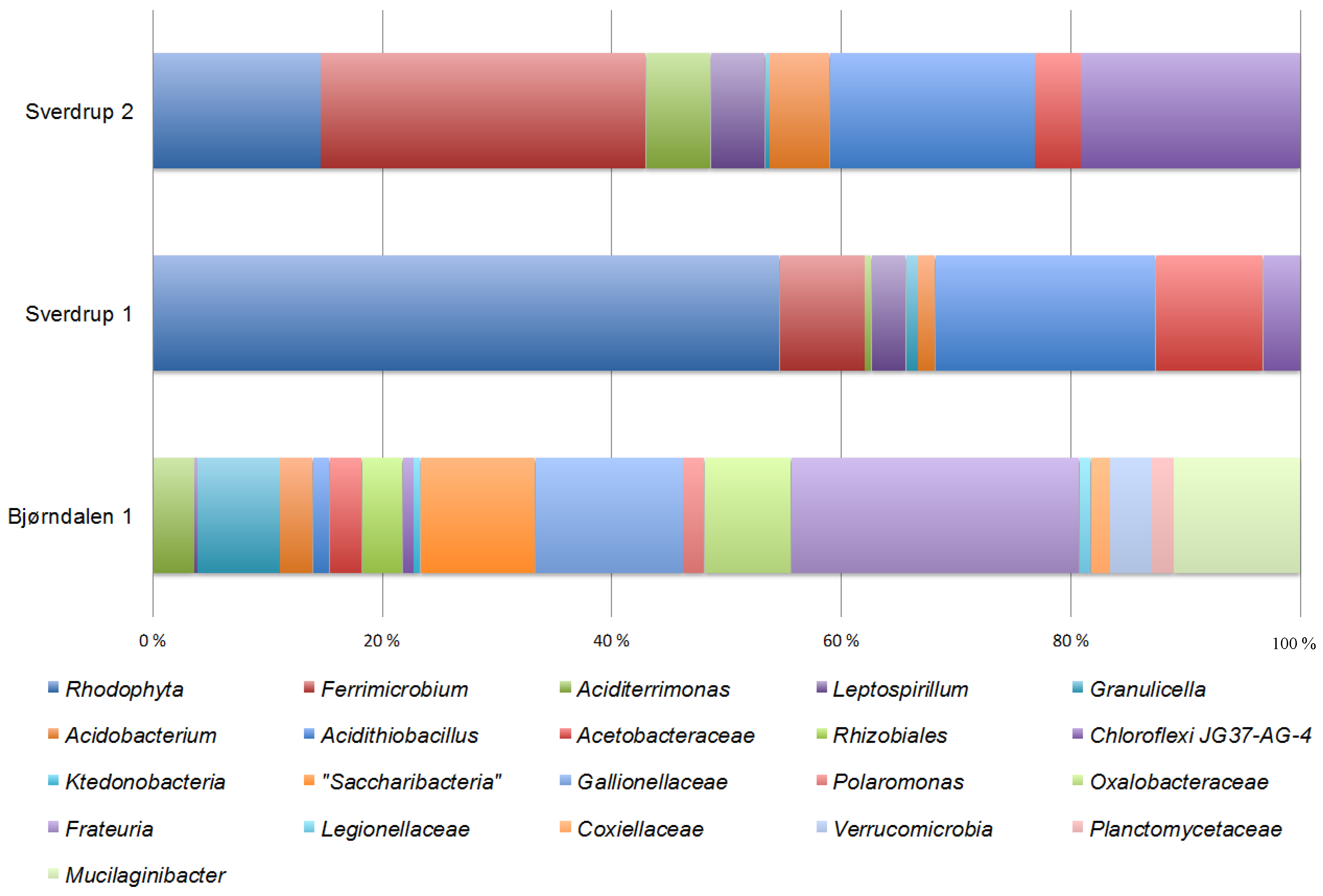 Microbial community composition on the different samples from acid mine drainage at Bjørndalen and Sverdrup areas. The figure shows the percentage of classified reads from the tagged amplicon library for each sample.
