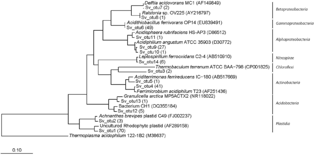 Taxonomic assignment and phylogenetic analysis from the Sverdrup library revealed a low phylum-diversity (six main phyla) similar to Bd1 library (five phyla/candidate divisions) but considerable small compared to Bd3 (10 phyla/candidate divisions). Their phylogenetic position is represented in supplementary Figure A1, Figure A2 and Figure A3 Sequences obtained from Sverdrup were derived from organisms that phylogenetically related to the Proteobacteria. Within the Alpha class, several OTUs were found related to the genera Acidiphilium and Acidisphaera (both within the family Acetobacteraceae). Within the Beta class, two OTUs were related to Ralstonia and Delftia (Burkholderiales). All the OTUs within the Gamma class were closely related to the psychrotolerant iron oxidizing bacterium At. ferrivorans. All the actinobacterial OTUs clustered within the Acidimicrobiaceae, closely related to the genera Ferrimicrobium and Aciditerrimonas. One single OTU clustered within the phylum Chloroflexi, with no close cultivated representative. Some sequences were related to the iron oxidizing bacterium Leptospirillum (phylum Nitrospirae) and several other OTUs to different members of the Acidobacteria like Granunicella or the unclassified acidobacterium CH1. Finally sequences clustering the Cyanobacteria, and most likely representing photosynthetic plastidial sequences from both Rhodophyta and Bacillariophyceae (diatoms) were also retrieved.