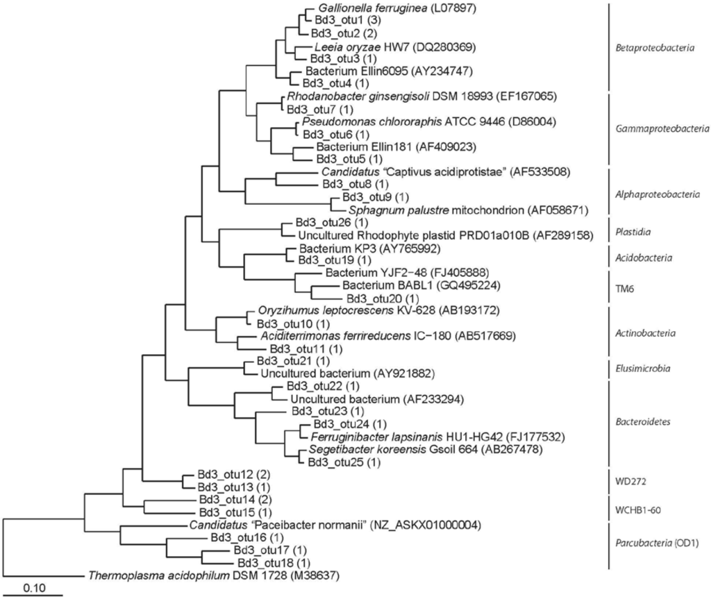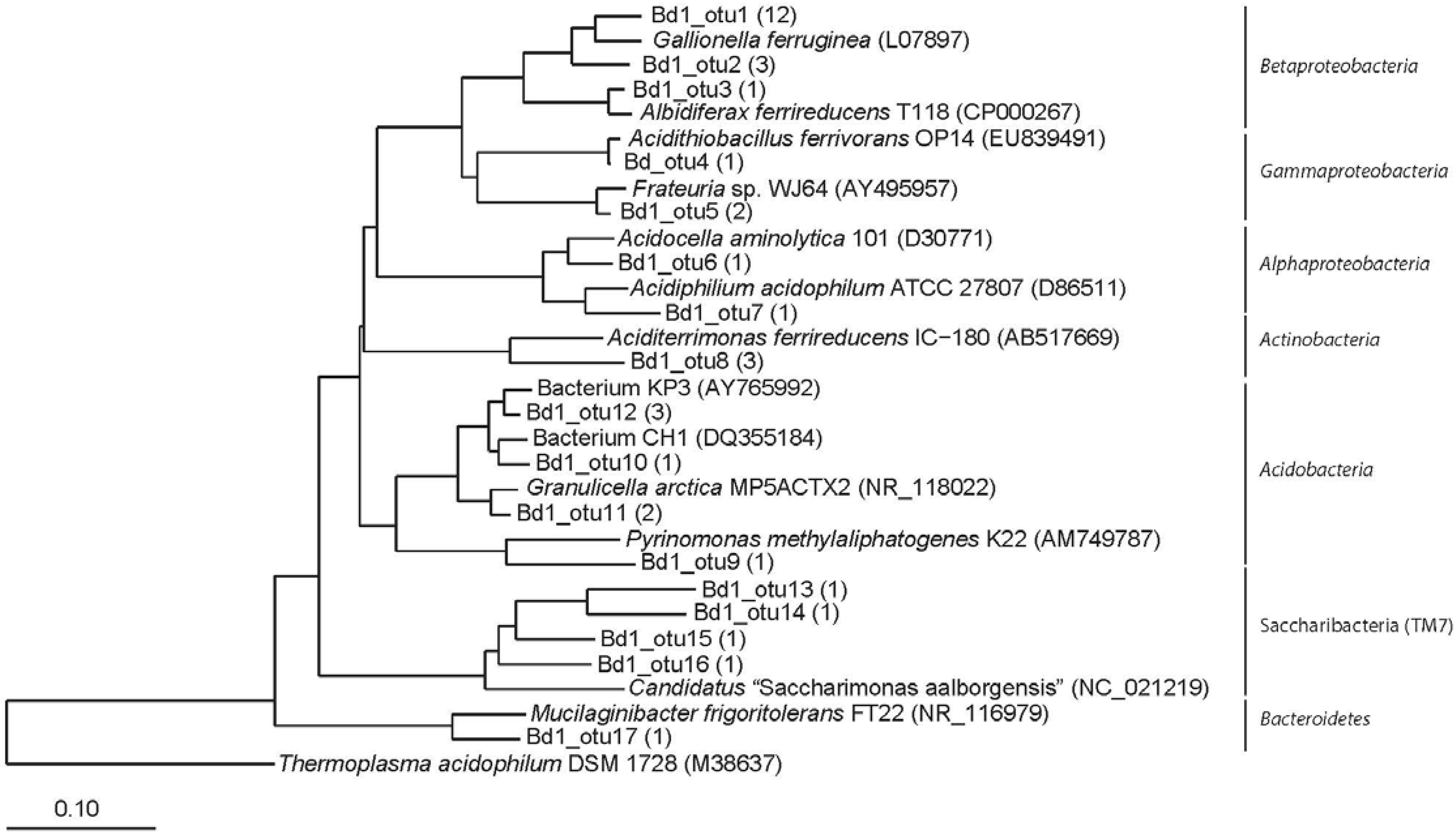 The phylum Proteobacteria was also represented in the Bjørndalen libraries (Figure A2 and Figure A3). The Bd1 library contained some OTUs within the Alpha class related to the acidophilic heterotrophs Acidocella and Acidiphilium (Acetobacteraceae). The Beta class was represented by few OTUs related to Gallionellaceae in addition to an OTU related to Albidiferax ferrireducens. The acidophilic At. ferrivorans (Gamma class) was also detected in this library together with the acid thriving Frateuria spp. The phylum Actinobacteria was also represented with an OTU related to the iron reducing bacterium Aciditerrimonas. The Acidobacteria were also well represented, with few OTUs related to Pyrinomonas, Granulicella, and Acidobacterium-like. One more OTU clustered with the genus Mucilaginibacter within the phylum Bacteroidetes. Finally, it was surprising the amount of OTUs that clustered the candidate divisions Saccharibacteria (formerly TM7). The library Bd3 showed some similarities but also showed more diversity in terms of OTU richness. Sequences related to Gallionellaceae (Betaproteobacteria) were also retrieved here. Some other genera and unclassified soil bacteria from the Beta- and Gamma- classes were also detected here. The Alphaproteobacteria class were represented by some mitochondrial sequences and the symbiont Candidate “Captivus acidiprotistae”. OTUs within the phylum Actinobacteria (Aciditerrimonas and Oryzihumus) and unclassified members of the phylum Acidobacteria were also detected. Several OTUs represented different genera within the Bacteroidetes, such as Ferruginibacter, Segetibacter and some uncultured members. One OTU was clearly related to Rhodophyta plastidial ribosomic sequences. Also one single OTU clustered tentatively with the Elusimicrobia. The high diversity of candidate divisions including “Parcubacteria” (OD1), WCHB1-60, WD272, or TM6 was also surprising.