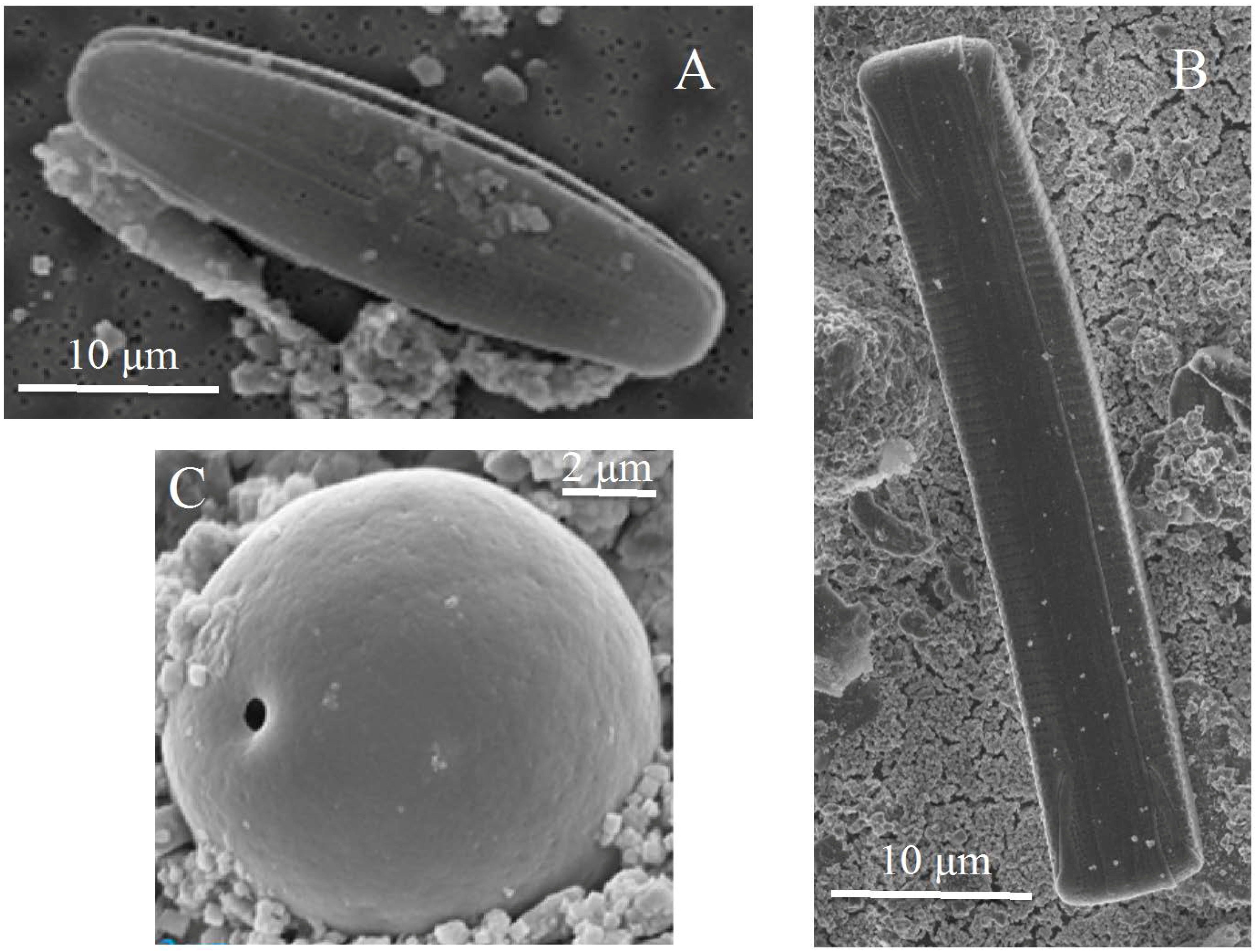 Scanning electron micrographs of two pennate diatoms (A,B) observed in the samples from Sverdrup as well as an eukaryote with physical similarities to Chrysophyceaen stomatocysts (C).