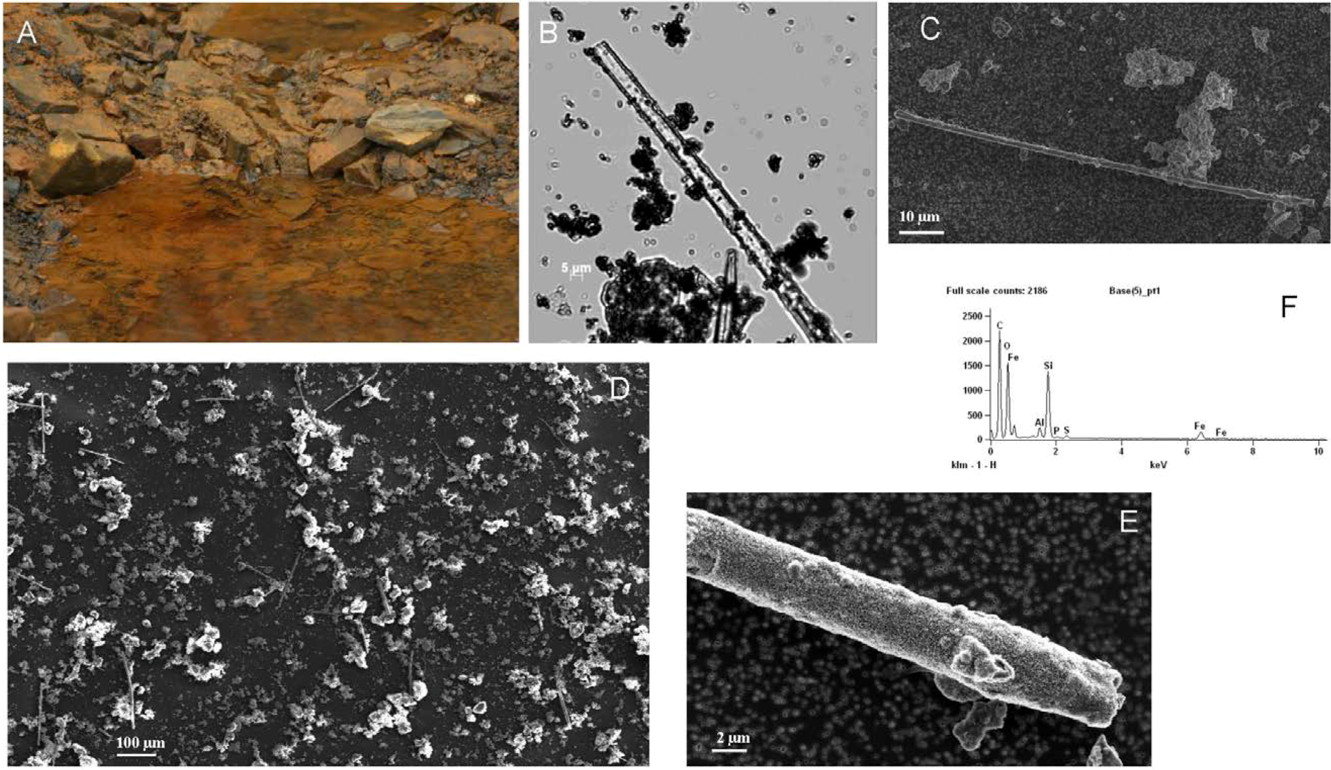 (A) Close up picture of the ochre mineral coat at Bjørndalen. (B) Phase contrast light micrograph showing iron stalks. (C,D) Scanning electron micrographs of iron stalks. (E) Energy dispersive X-ray spectroscopy (EDS) coupled to scanning electron microscopy from an iron stalk.