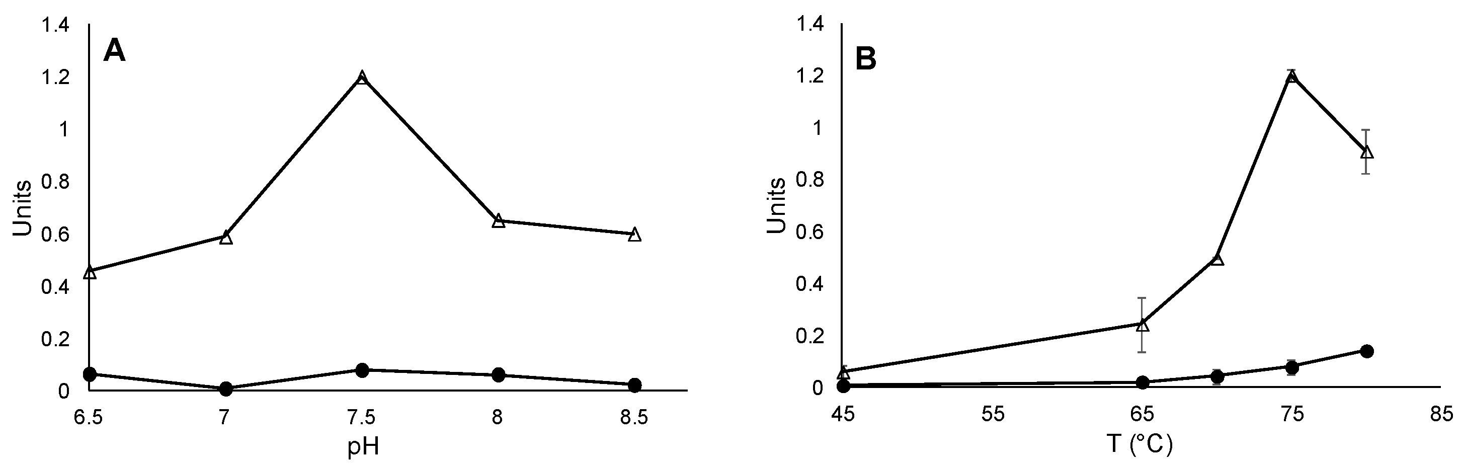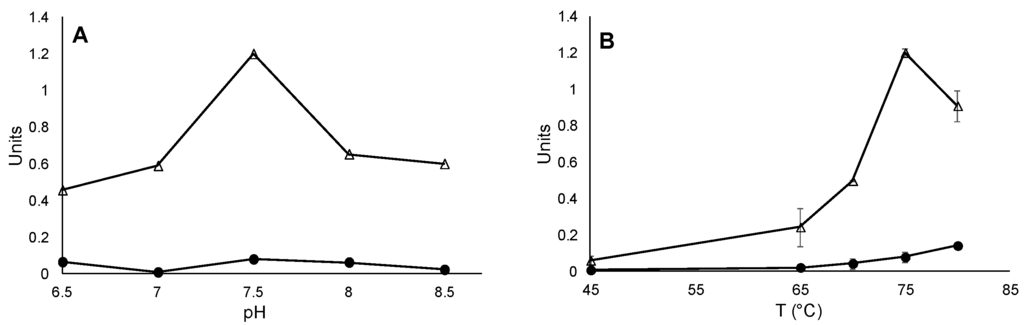 Determination of Sb. thermosulfidooxidans Sor properties in crude extracts. Optimal pH values (A); and temperature (B) were determined for the oxygenase (triangles) and reductase (circles) enzyme activities. In (A) experiments were done at 75 °C; and in (B) at pH 8. Standard deviation values from triplicates are shown.