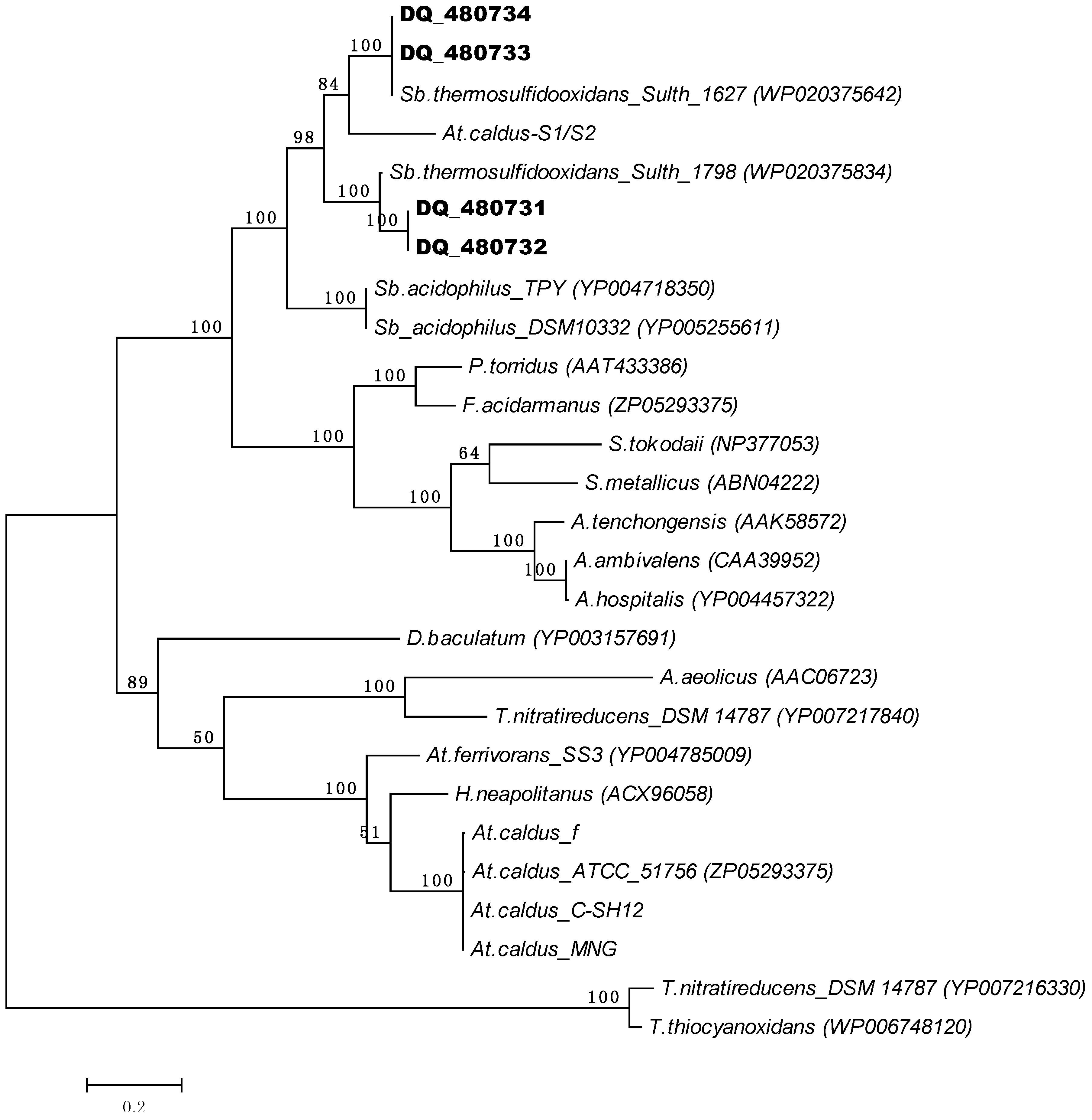 Maximum likelihood phylogenetic tree showing relationship amongst bacterial and archaeal Sor proteins. Sor aminoacidic sequences of Sb. thermosulfidooxidans DSM 9293T (WP_020375642 and WP-_020375834), A. aeolicus VF5 (NP_21332), H. neapolitanus C2 (YP_003263105), At. ferrivorans SS3 (YP_004785009), At. caldus ATCC 51756; DSM 8589 (ZP_05293375), A. tengchongensis (AAK58572), A. ambivalens (CAA39952), Acidianus hospitalis(YP_004457322), Sulfolobus tokodaii (NP_377053), Picrophilus torridus (AAT43386), Ferroplasma acidarmanus fer1 (ZP_01708456), Desulfomicrobium baculatum DSM 4028 (YP_003157691), Sb. acidophilus DSM 10332T (YP_005255611), Sb. acidophilus TPY (YP_004718350), S. metallicus (ABN04222), Thioalkalivibrio nitratireducens DSM14787_1 (YP_007217840), and DSM14787_2 (YP_007216330), Thioalkalivibrio thiocyanoxidans (WP_006748120) were used. Additionally, Sor sequences from four metagenomic clones (DQ480731, DQ480732, DQ480733/ ABF20540, DQ48074/ABF20541) [41] and the SOR sequences obtained from At. caldus strains MNG, C-SH12, f and S1 and S2, obtained in this study (see text), were included.